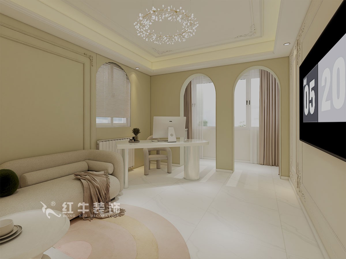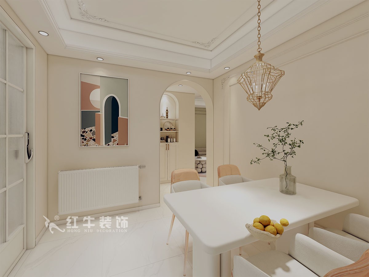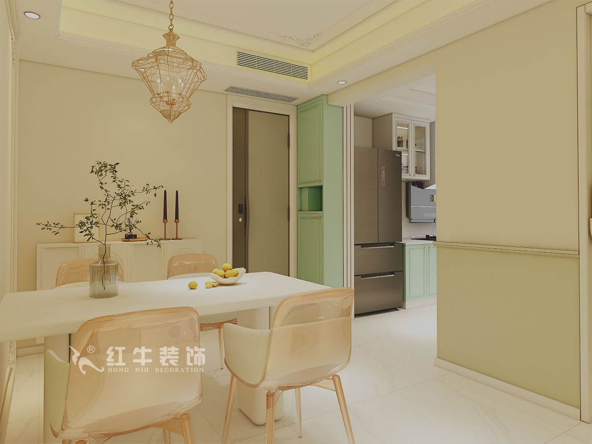 本案是本案客戶女兒回國臨時居住,以法式奶油風定義,網紅牛油果綠加上汝窯色,調節出歡快溫馨的效果,頂墻面線條增加立體層次感,設計上背景采用牛油果綠加上暖色的搭配,使空間看起來溫馨自然,利用原結構的特點制作出三個圓弧,交相呼應。