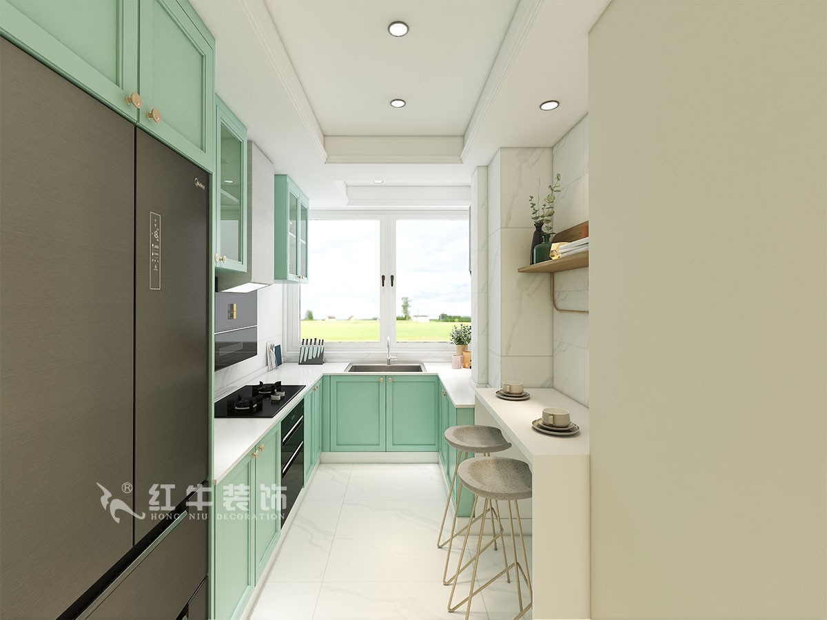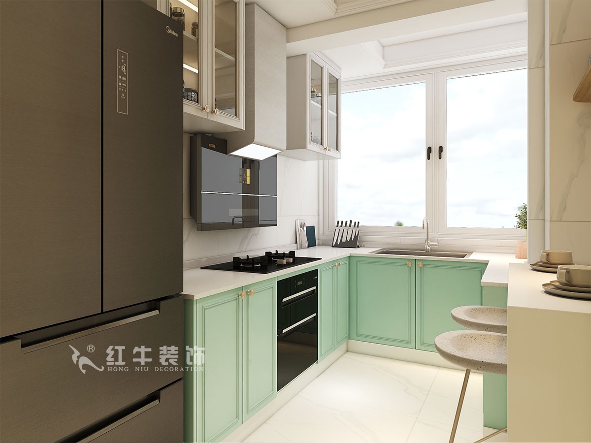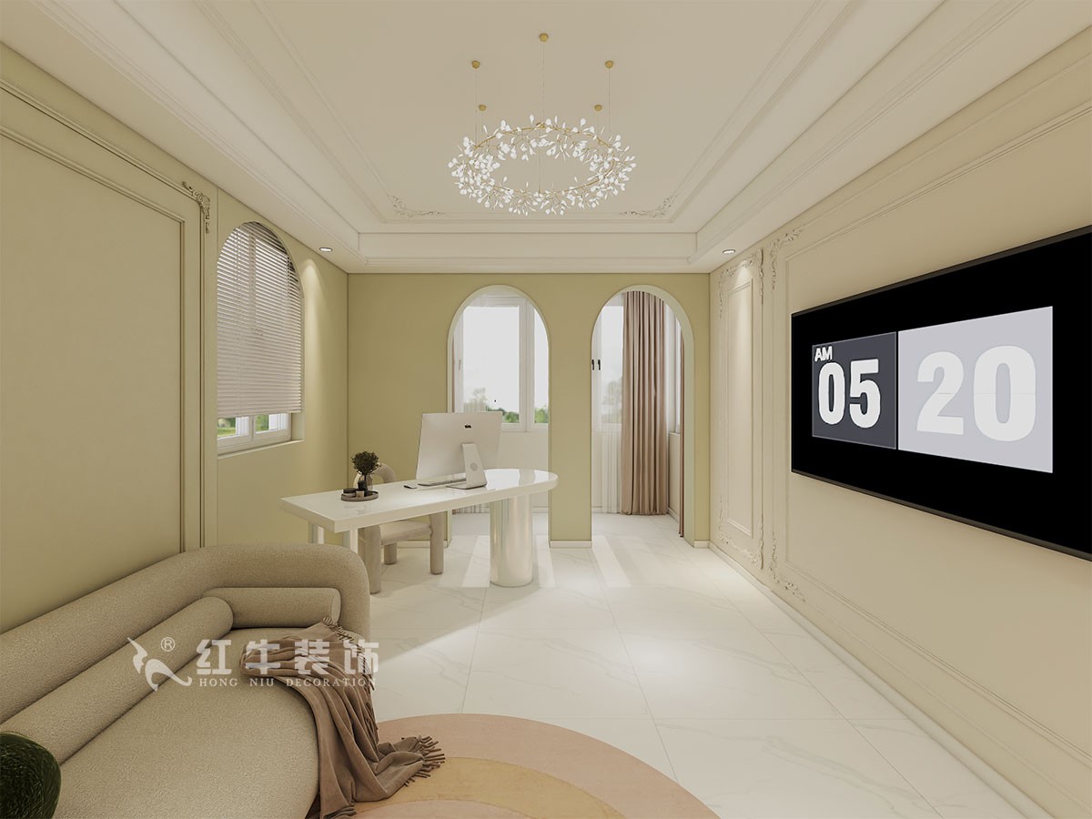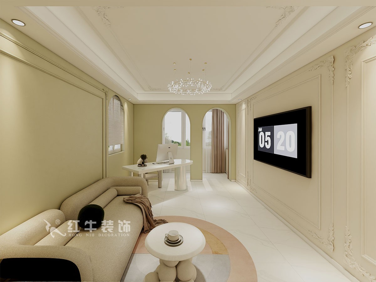 本案是本案客戶女兒回國臨時居住,以法式奶油風定義,網紅牛油果綠加上汝窯色,調節出歡快溫馨的效果,頂墻面線條增加立體層次感,設計上背景采用牛油果綠加上暖色的搭配,使空間看起來溫馨自然,利用原結構的特點制作出三個圓弧,交相呼應。