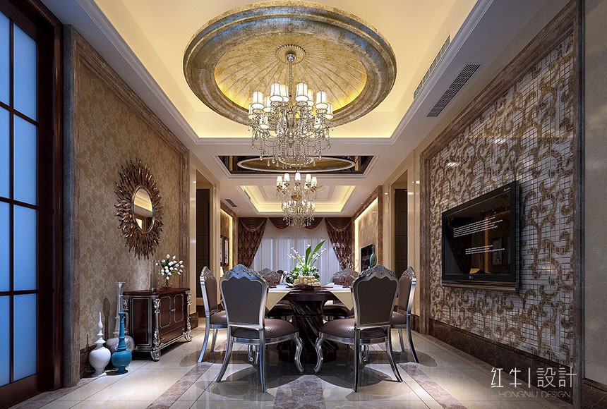 本方案是以歐式風格為主, 歐式的居室有的不只是豪華大氣,更多的是意境和浪漫,通過完美的曲線,精益求精的細節(jié)處理,帶給人不盡的舒適感,實際上和諧是歐式風格的最高境界。歐式風格強調以華麗的裝飾,農烈的色彩,精美的造型達到華貴的裝飾效果,客廳頂部用大型的燈池,并用華麗吊燈營造氣氛,并用帶有花紋的石膏線勾邊,地面以石材和地板為主,客廳用家具和軟裝來營造整體效果,深色的家具,色彩鮮艷的沙發(fā),都是本案歐式客廳里的主角,在加上墻面金屬框抽象畫,選一些西方藝術名家的贗品,直接把西方藝術帶到家里,以營造濃郁的藝術氛圍,表現主人的文化素養(yǎng)。