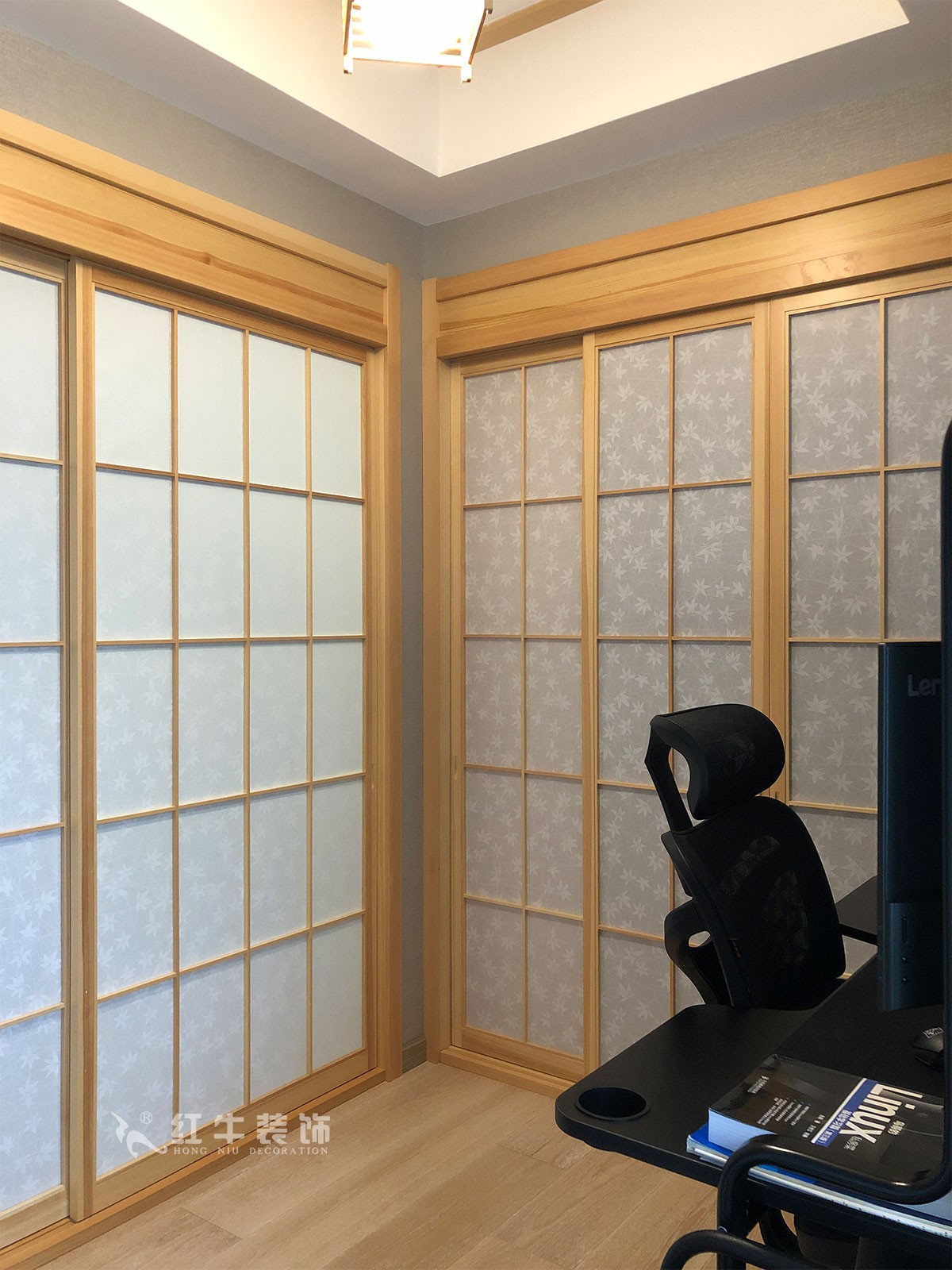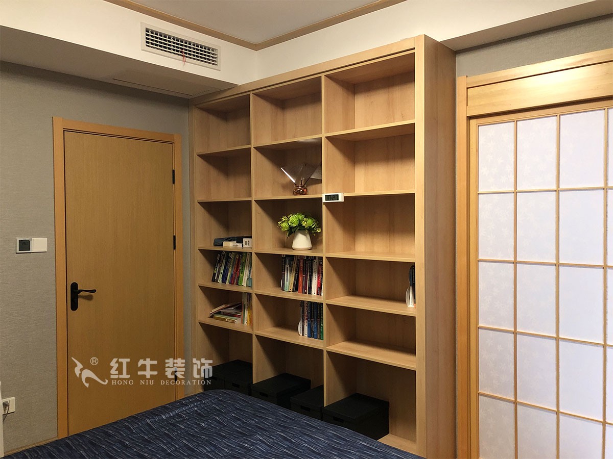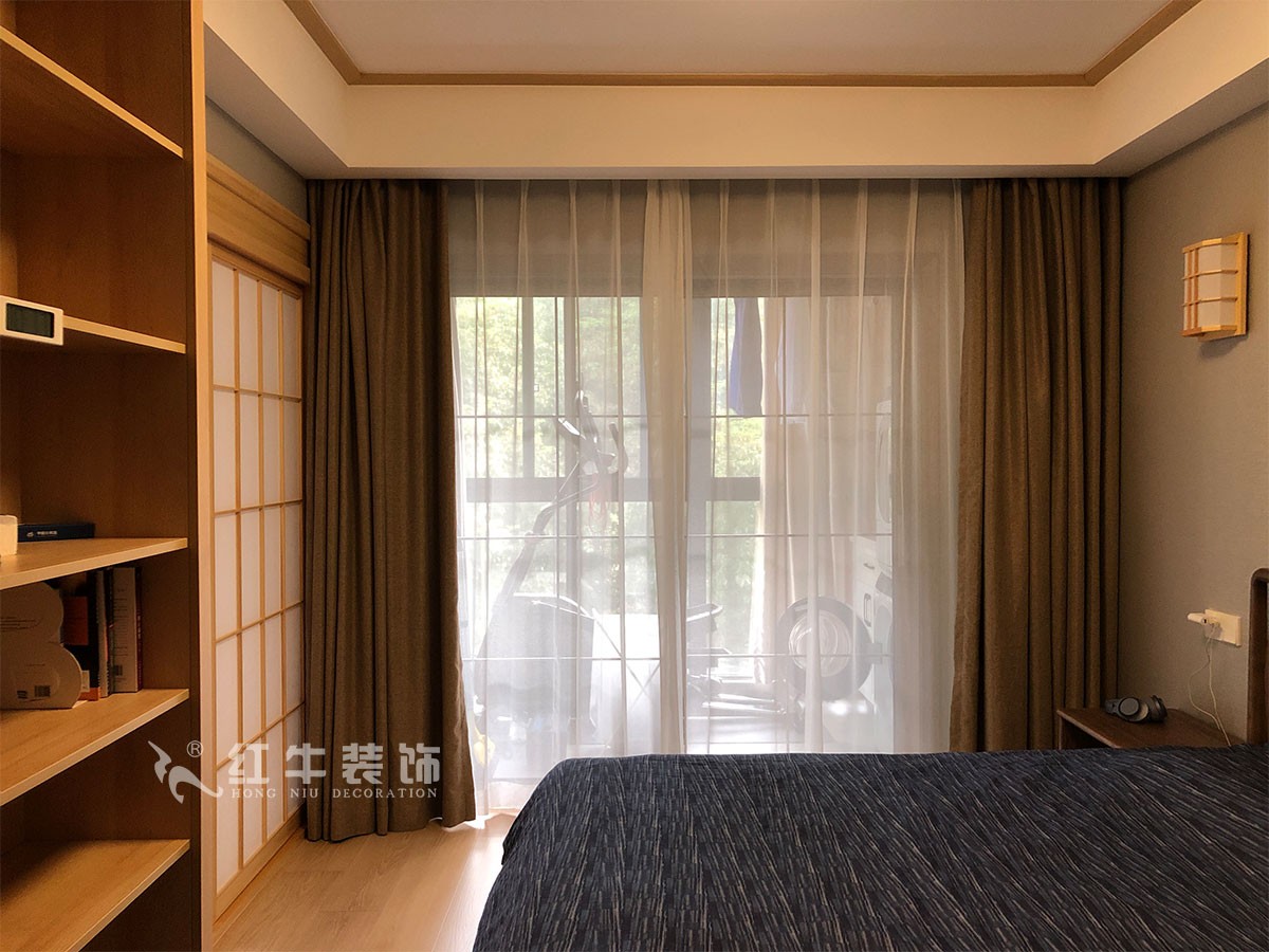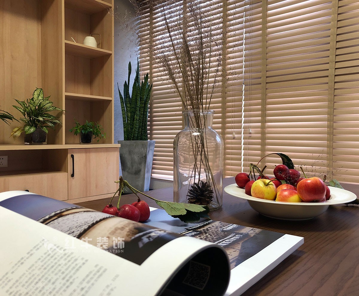 客餐廳色調(diào)清雅,休閑、隨性,又不失精致。電視背景墻依靠大面積開(kāi)放柜拓展儲(chǔ)物及裝飾功能,給居住者一個(gè)慵懶、明快的起居環(huán)境。臥室,依靠木質(zhì)家具本身的線條感,搭配同樣風(fēng)格的日式壁燈,給人以休閑自在的視覺(jué)感受。書(shū)房是辦公空間,整面墻全部以臥室同色的麻灰色墻布鋪貼,書(shū)桌旁轉(zhuǎn)角的飄窗給了原本不大的空間一個(gè)視覺(jué)的開(kāi)放性,心情也自然就舒緩很多。