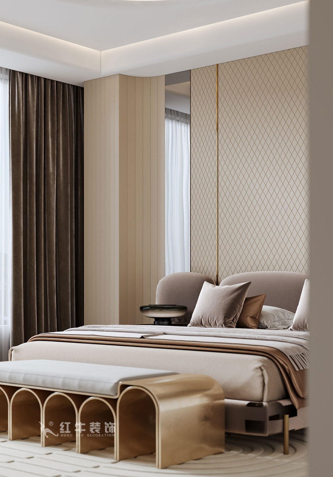主臥的設計上,用簡單的屏風設計分割出衣帽間,休閑區等功能分區,但是在視覺上并不會顯得擁擠。整體的吊頂進行改動,增加設計風格的體現,無主燈的設計滿足各個空間的照明需求,也讓空間更加簡潔明亮。