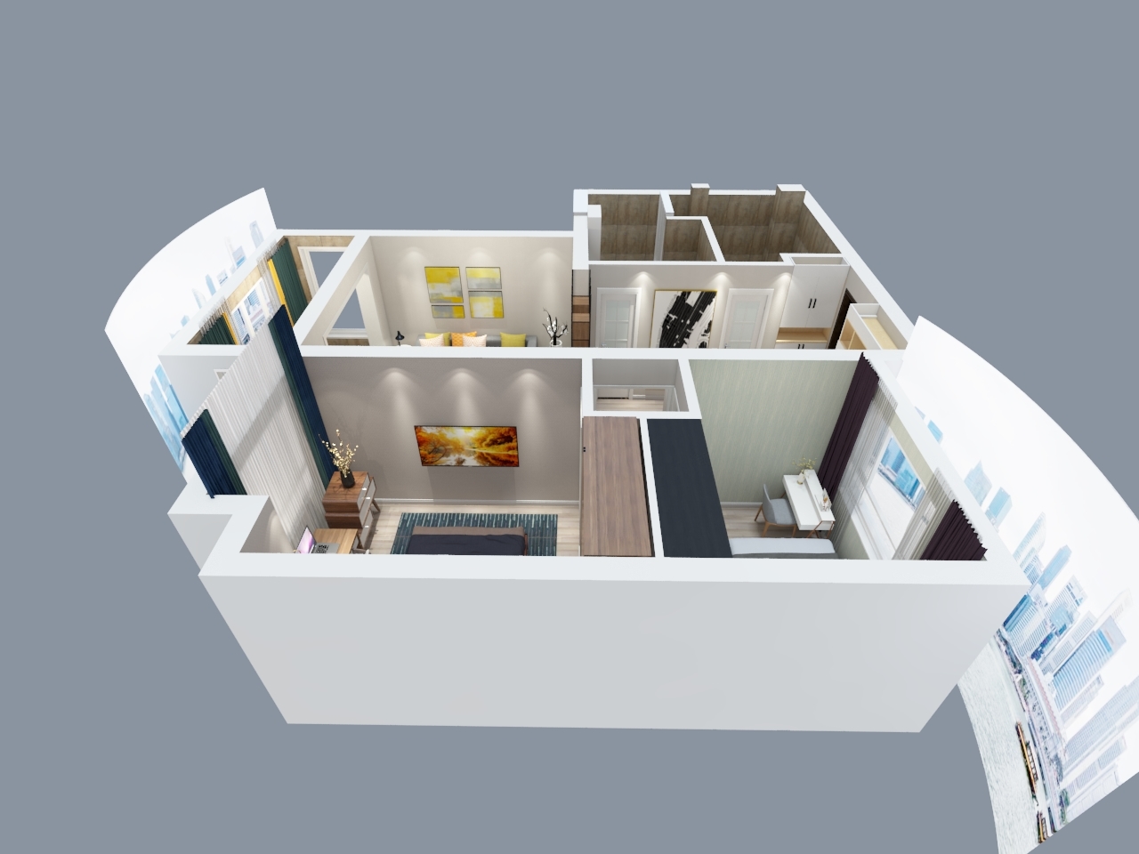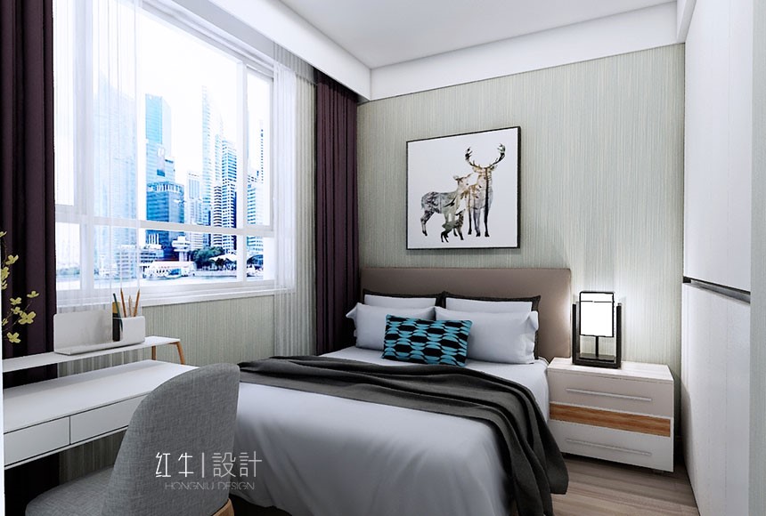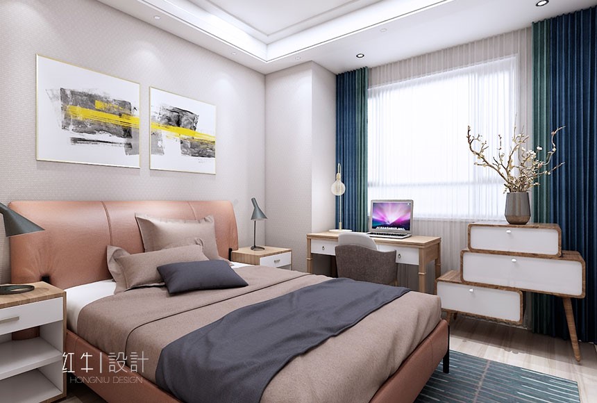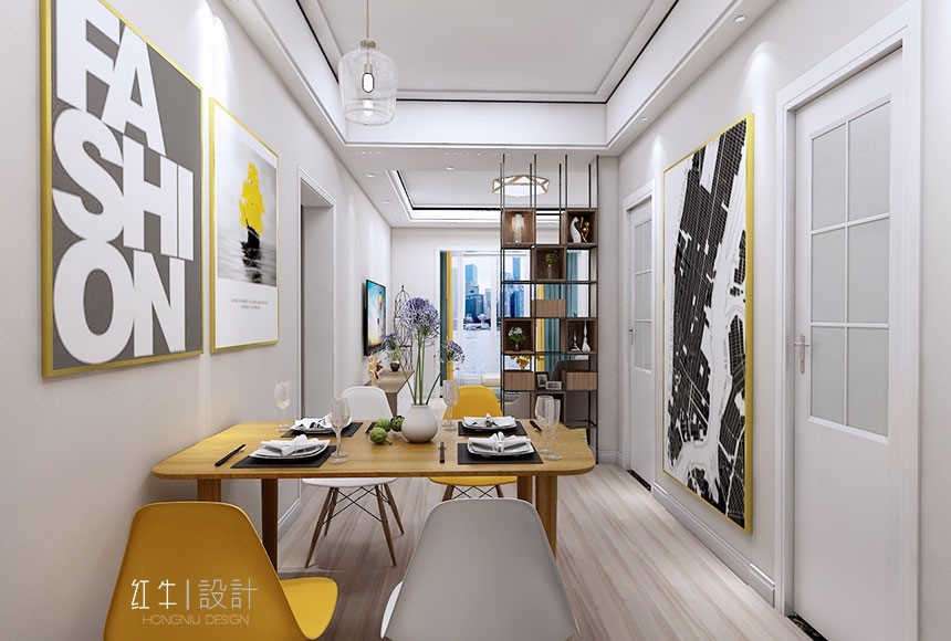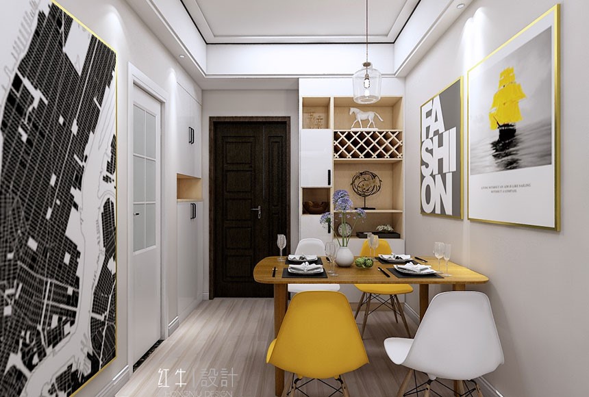 現代人的生活習性,喜歡簡單明了不拖泥帶水的東西,都市的快節奏,讓人們希望在房子里找到家的溫馨??蛷d淺灰色的墻面讓人有安靜下來的體驗,木色的家具,加以搭配撞色的門板,不會有原始的呆板。木色的家具配以時尚的撞色,大膽又不失規矩,甚是合適。大量的留白,使空間更加時尚和安靜。房間木色的拼色和皮質的碰撞,配以稍深的墻紙,溫暖又清新,讓主人能在疲憊一天的工作中,舒服的進入夢鄉。次臥朝北,運用淺綠色的墻面,將空間帶進自然,