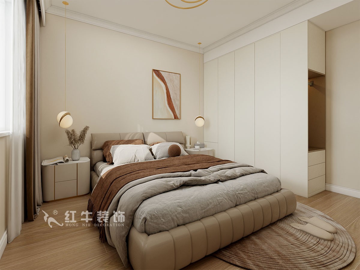 臥室說明:搭配大面積的白色定制衣柜,床頭的光源以不同形勢呈現,既滿足不同燈光需求,又恰到好處地起到了裝飾效果,使整體臥室空間呈現明亮、溫柔的舒適狀態。