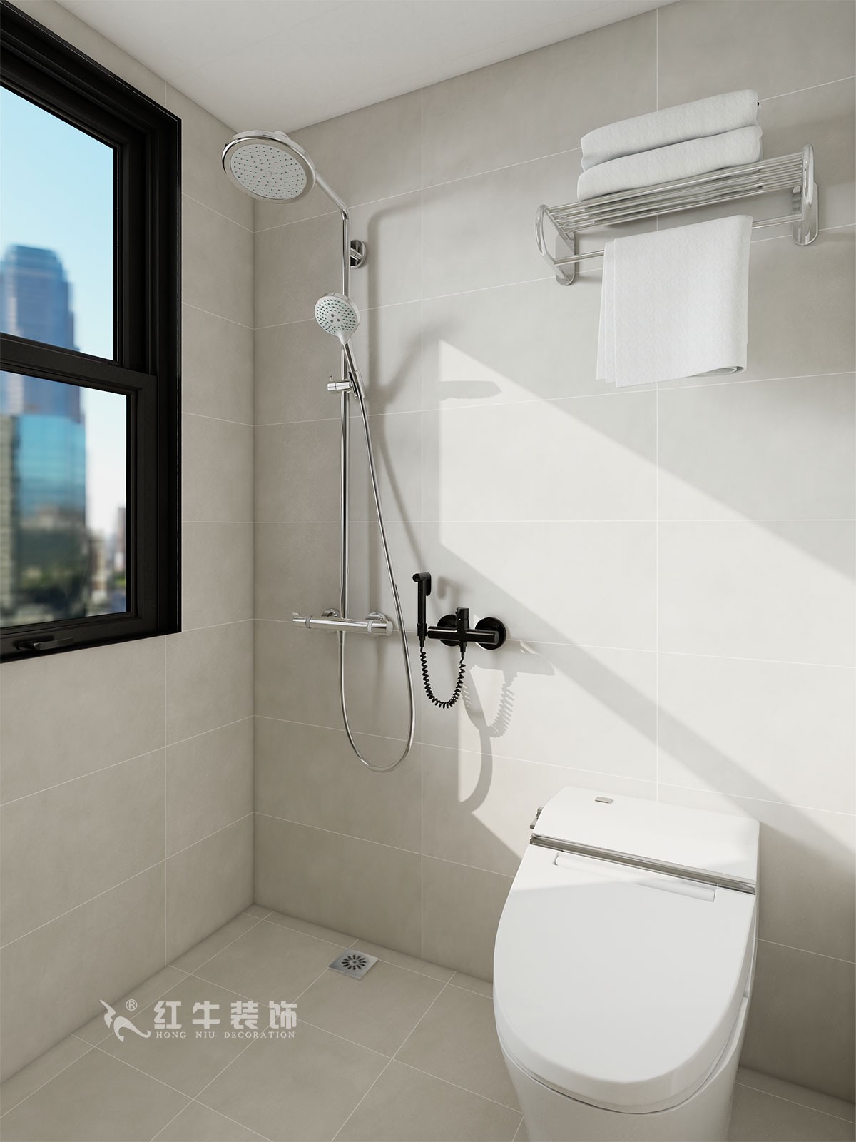 衛生間說明:干區選擇整體色彩搭配干凈、大方,墻面設計選擇大尺寸瓷磚上墻,高級感滿滿。