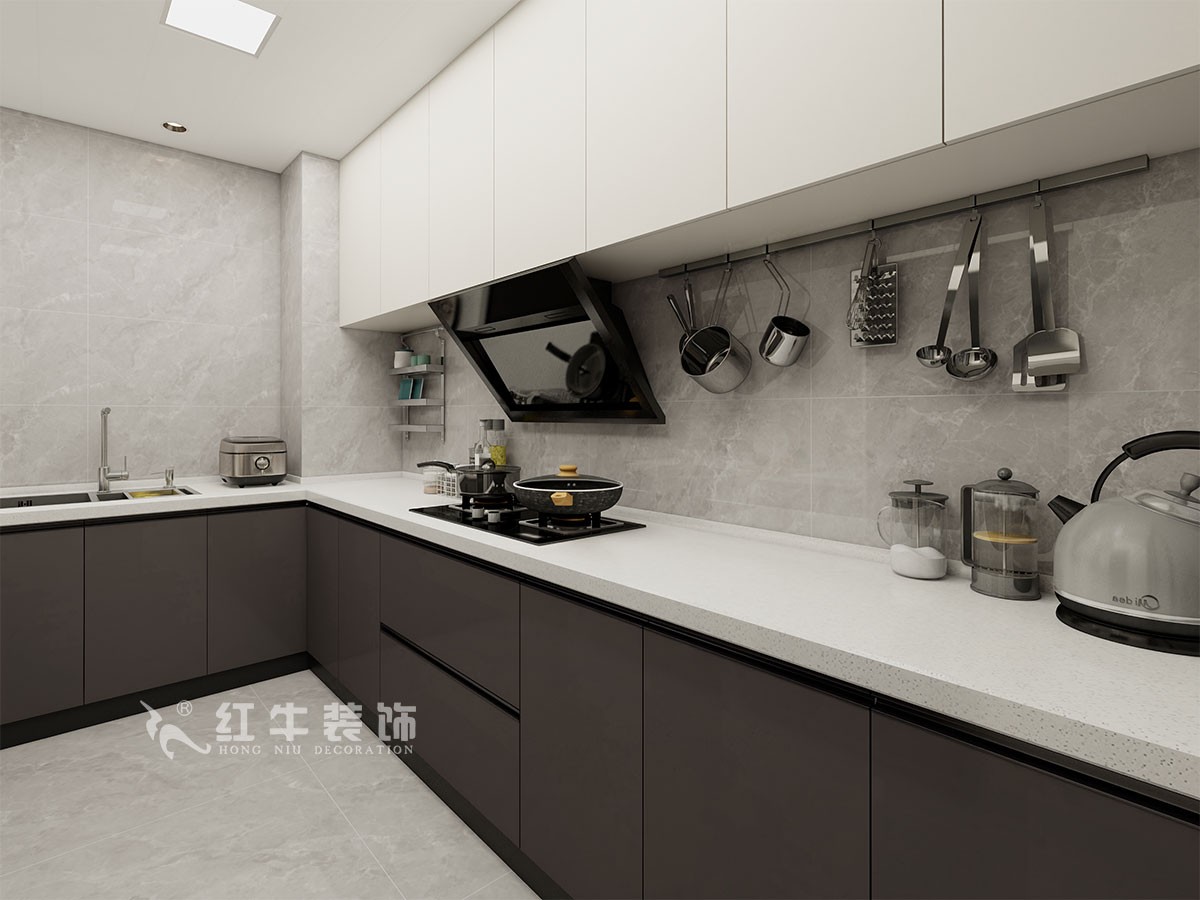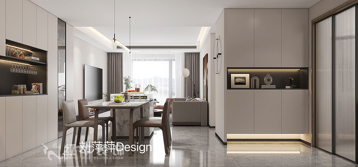 業主是一對小年輕,作為婚房使用,廚房和衛生間進行了墻體改造,這樣空間更加合理,利用率也比較高。主衛改成了衣帽間,考慮兩房兩個衛生間沒有必要,客戶正好對儲物要求比較高。餐廳區域比較大,做了餐邊柜和鞋柜+餐桌島臺的設計,不僅滿足了儲物的需求,同時也使得空間更加豐滿、大氣、時尚。
