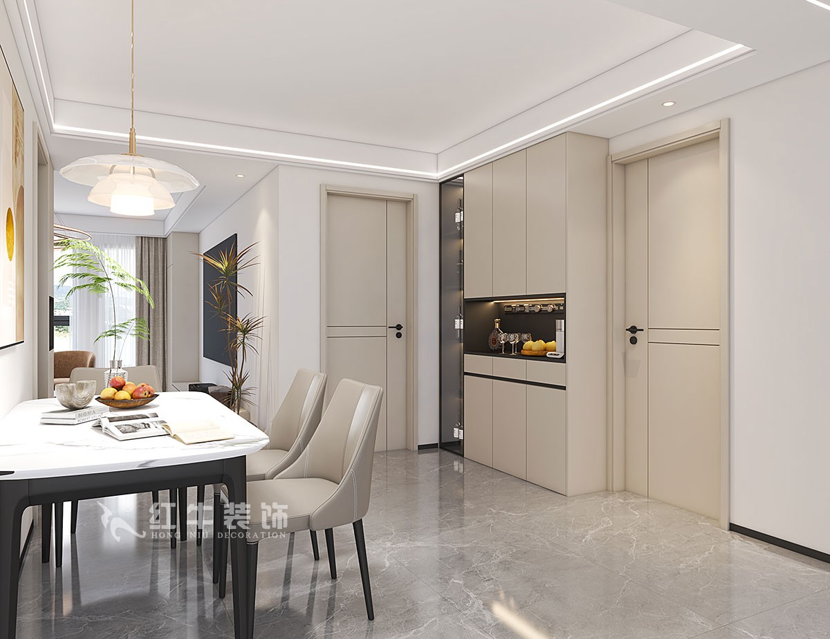 業主是一對小年輕,作為婚房使用,衛生間進行了布局調整,廚房把北陽臺并進來,使整個廚房利用率更高。墻體改造,這樣空間更加合理,利用率也比較高。餐廳區域比較大,做了餐邊柜設計,滿足了儲物的需求,同時一進門正對著作為一個裝飾。利用客廳空間做了一組儲物柜、鞋柜的設計,客廳不僅布置得美觀,還兼顧了功能性和實用性。