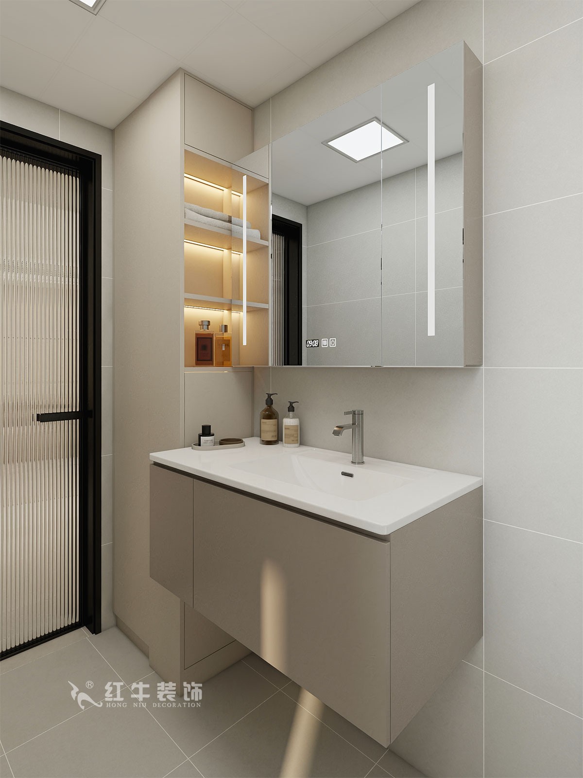 衛(wèi)生間說明:選擇整體色彩搭配干凈、大方,選擇大尺寸淺灰色瓷磚上墻,氛圍感溫馨感滿滿。