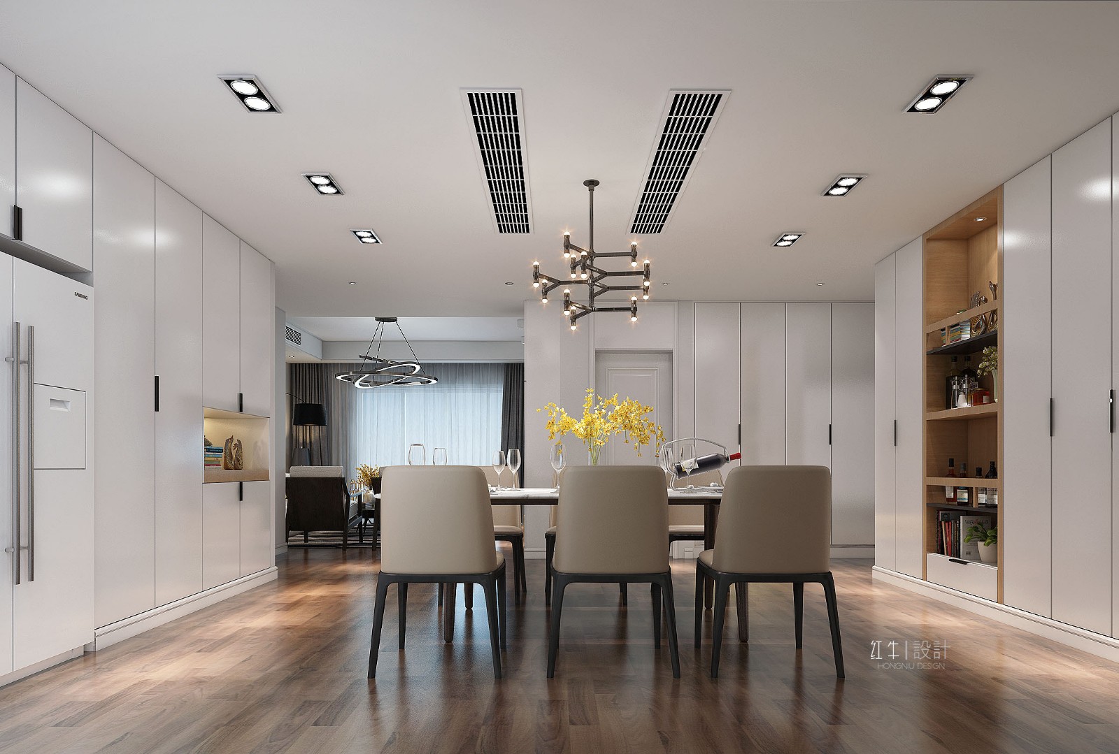 此房型規(guī)整,南北通透,最大的問(wèn)題就是如何利用餐廳的那個(gè)區(qū)域,大部分業(yè)主都會(huì)把他做成房間或者書(shū)房,當(dāng)然這個(gè)客戶我們做過(guò)很多的方案,不斷的溝通,最后把原來(lái)敞開(kāi)的地方全部做成了餐廳,一個(gè)大的長(zhǎng)條桌,增大了整個(gè)餐廳的既視感,大氣而簡(jiǎn)單,體現(xiàn)了港式得商務(wù)風(fēng)。客戶對(duì)收納空間的要求比較高,包括客廳的背景墻也采用了一些柜子的組合來(lái)完成整面墻的設(shè)計(jì),能動(dòng)的墻體幾乎都有改動(dòng),大大的增加了每個(gè)空間的利用率。