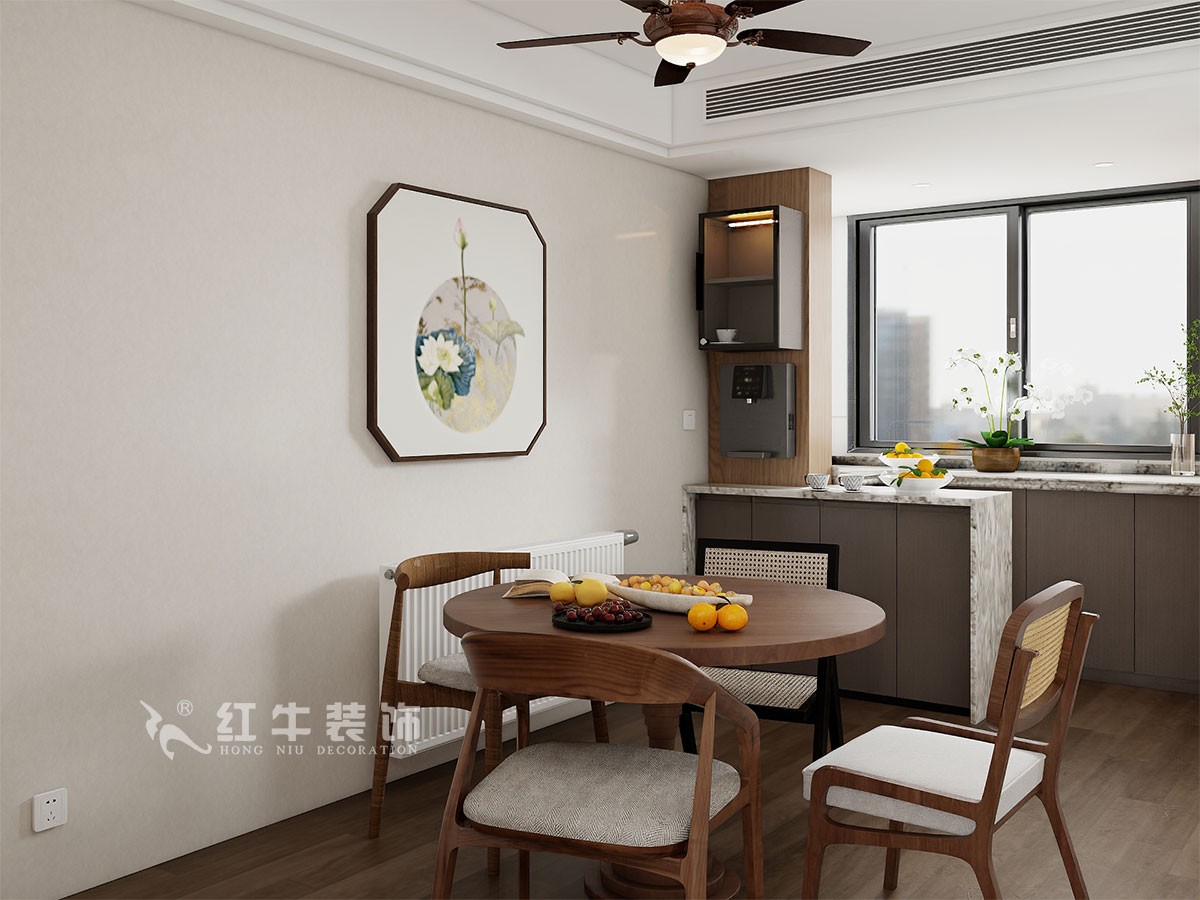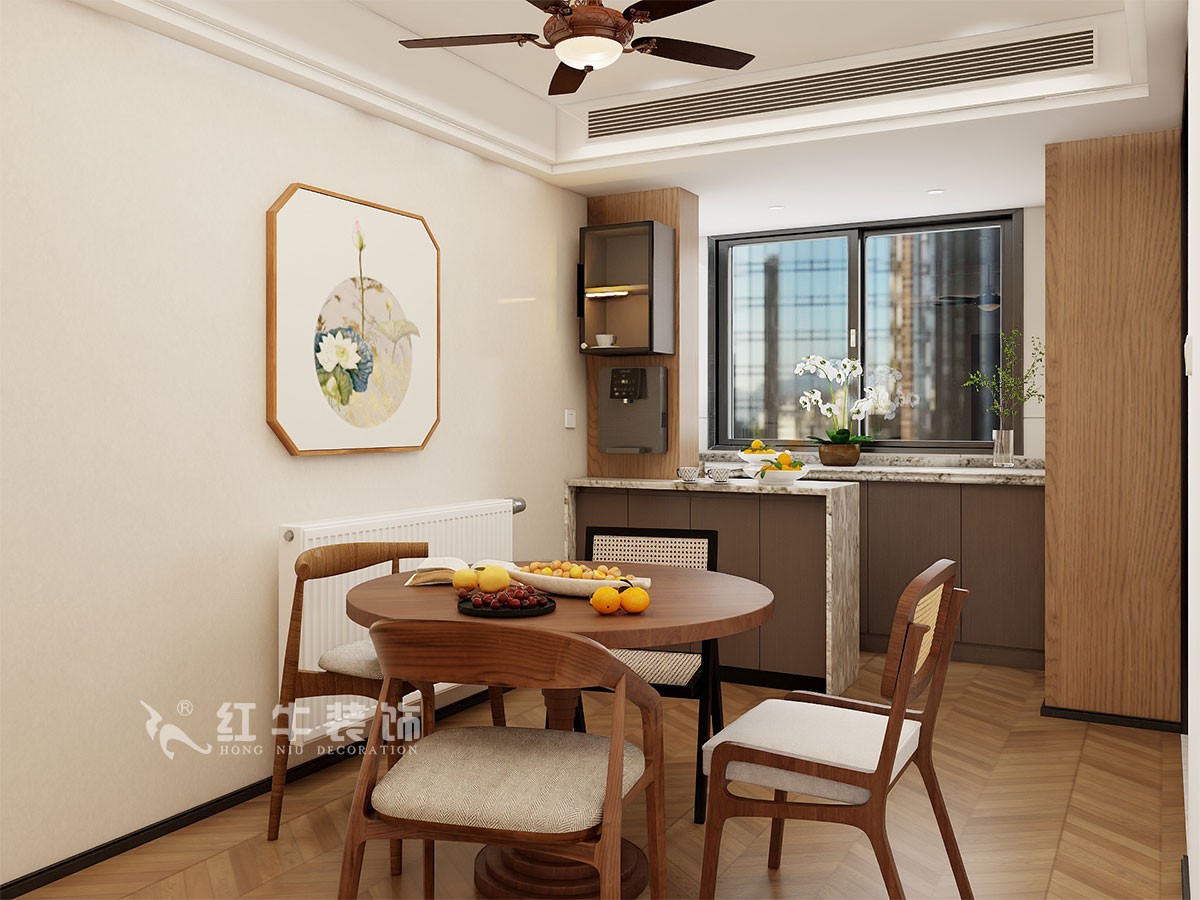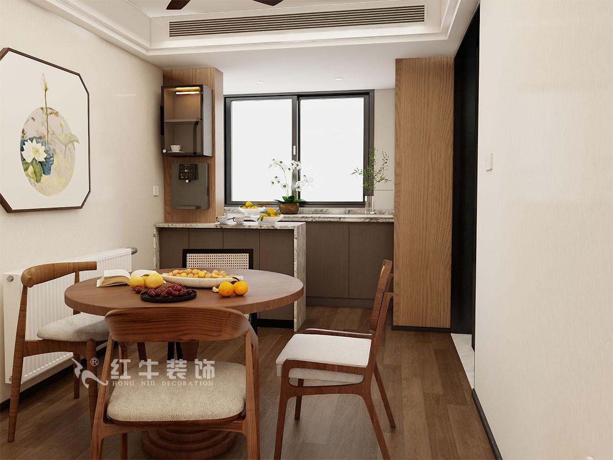 整體結構調整主要是北陽臺的利用,去承重墻,納入到餐廳來,樓層在10樓,正好可以引進小區內景,讓人身心愉悅。做了一水吧臺和水果切配區,再做一組餐邊柜,實用的同時,給生活增添儀式感和幸福感。整體色調主要柚木色為主,墻面白色乳膠漆,吊頂簡約,配上暖色的燈光,回到家中,有種度假的感覺。