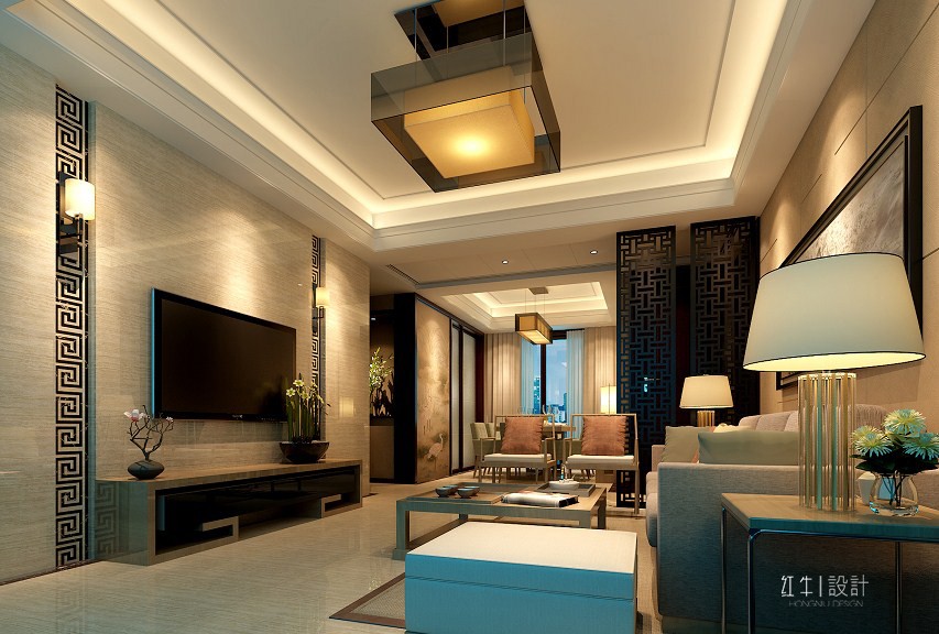現代風格的家具表明了整個空間的基調,中式風格的紋路組合使空間不至于太過呆板,添加了一絲俏皮的因素,偌大的花格燈成為視覺中的一大亮點。