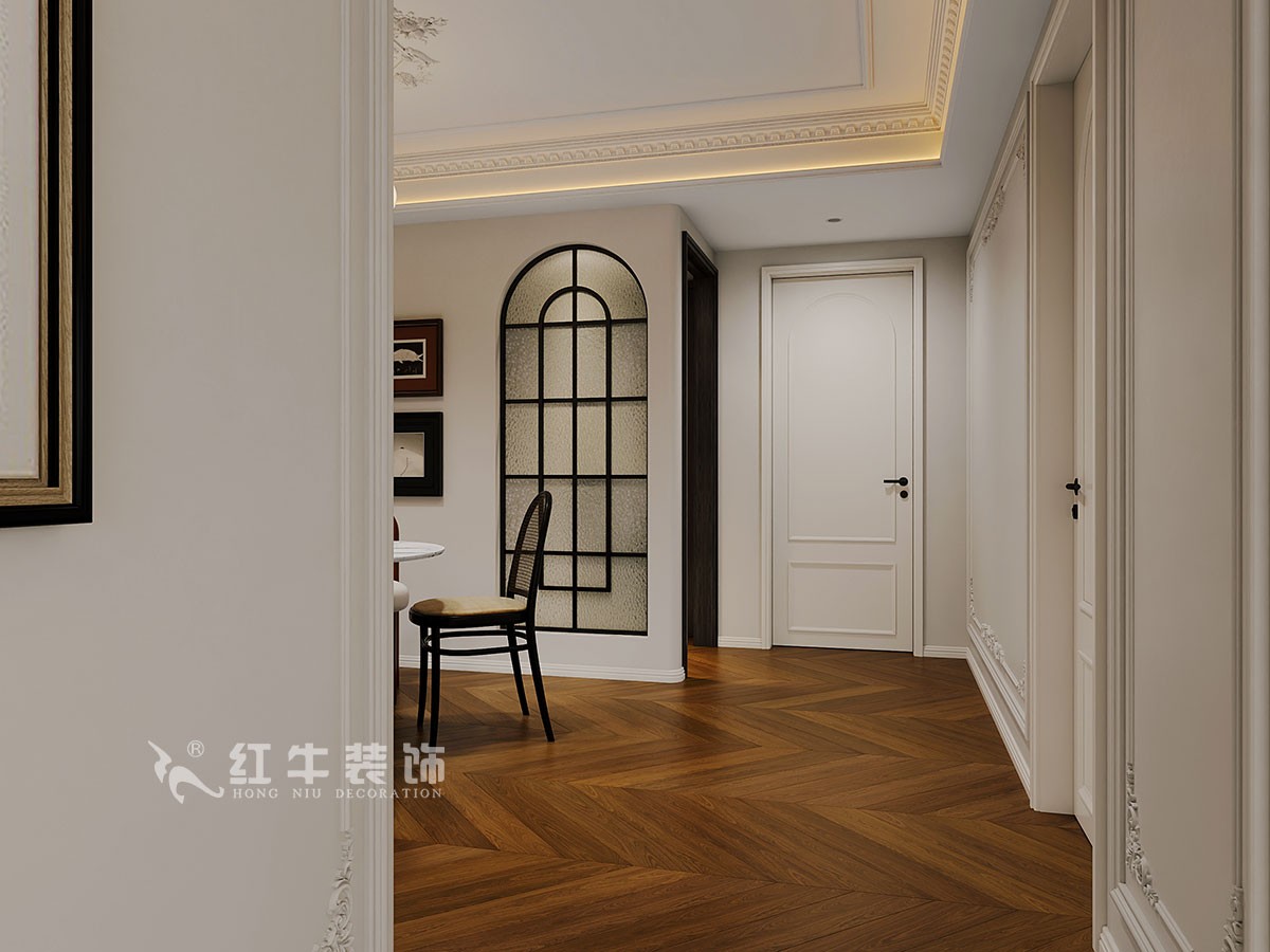 本案的設計定位為法式中古風格。客戶一對夫妻帶二個小孩居住。原始戶型為四房兩衛比較方正,主衛略小。跟客戶溝通擴大了主衛的空間,客衛做干濕分區,這樣更能滿足客戶的需求。生活陽臺從保姆房進出避免了保證小孩有個安靜獨立的空間整個空間寬敞明亮,居住更舒適。