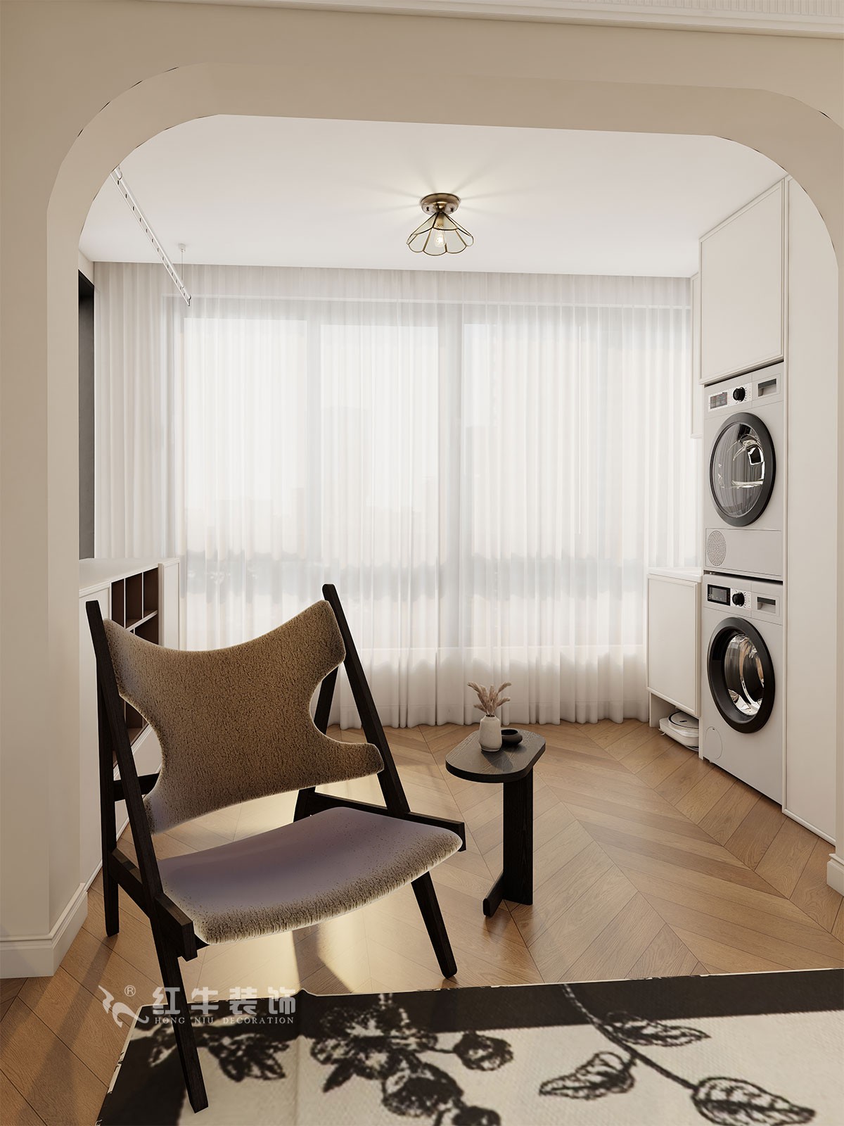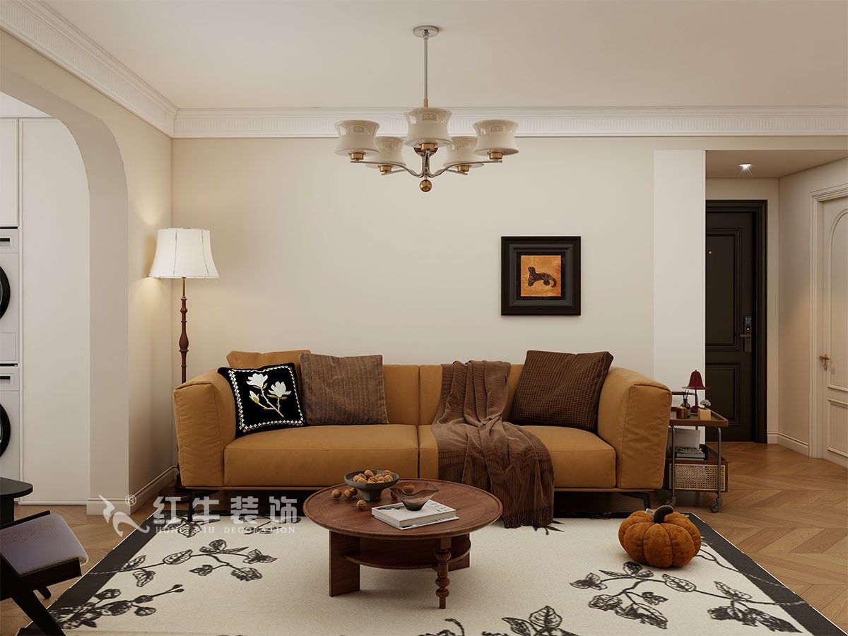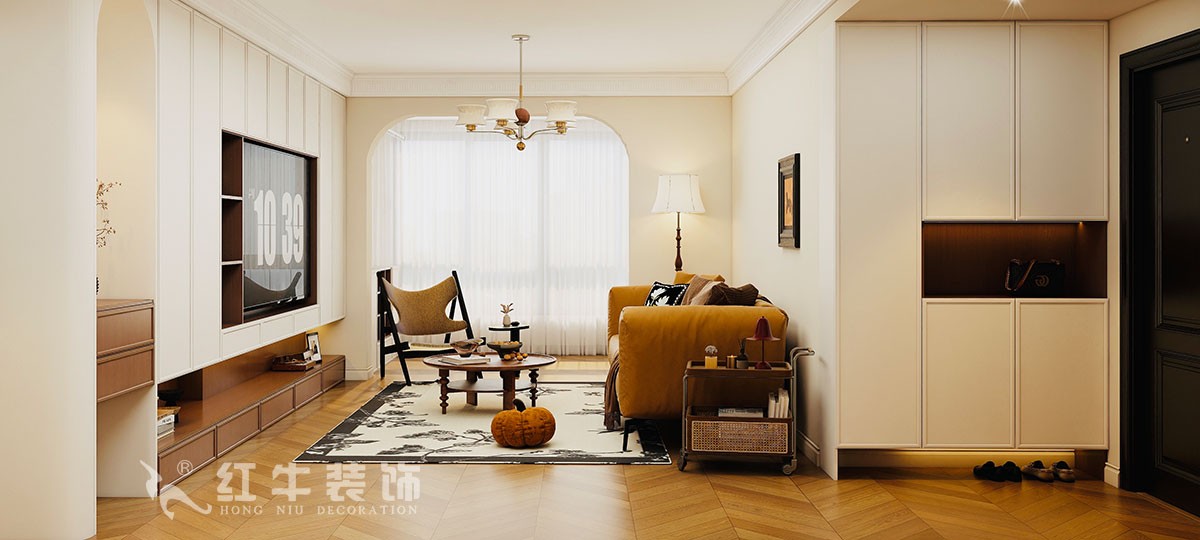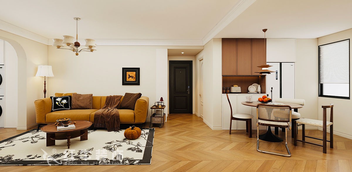 空間布局:開放式客餐廳通過拱形門洞劃分區域,增強空間層次感;鋼琴線作為視覺焦點,搭配復古線條與暖光照明,營造優雅氛圍。