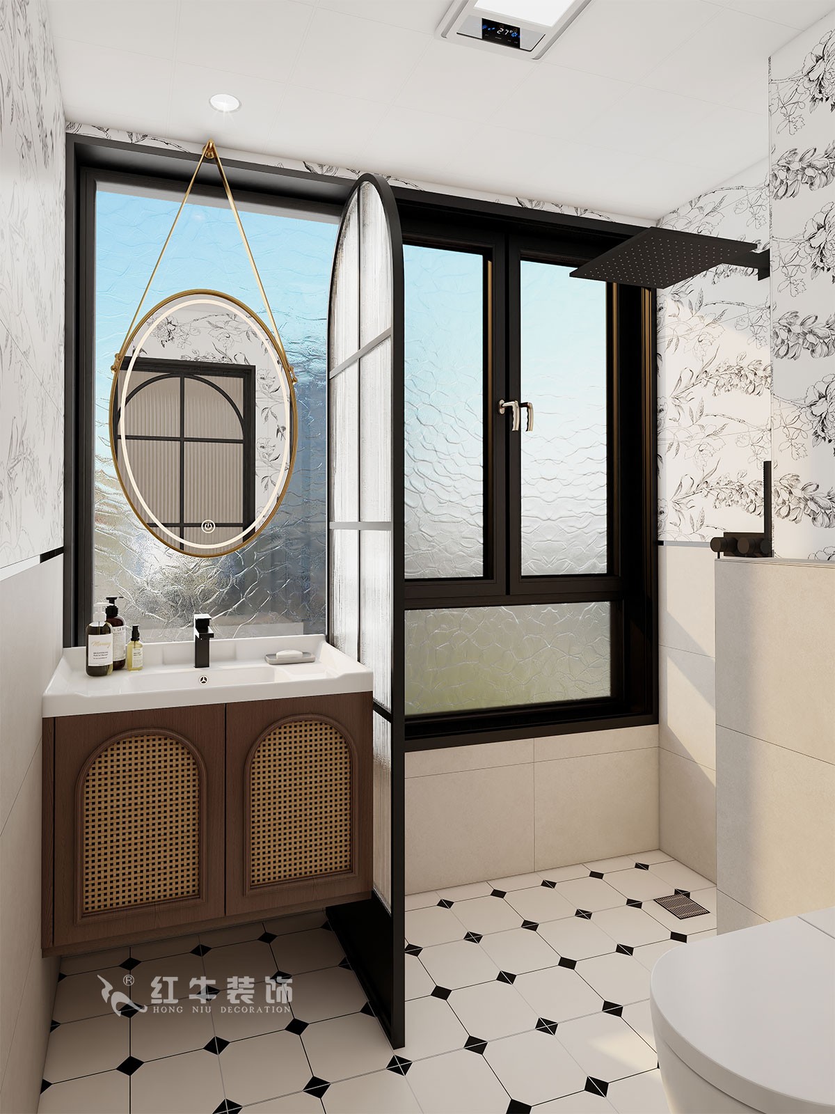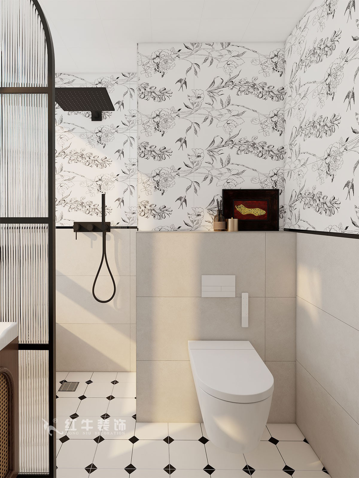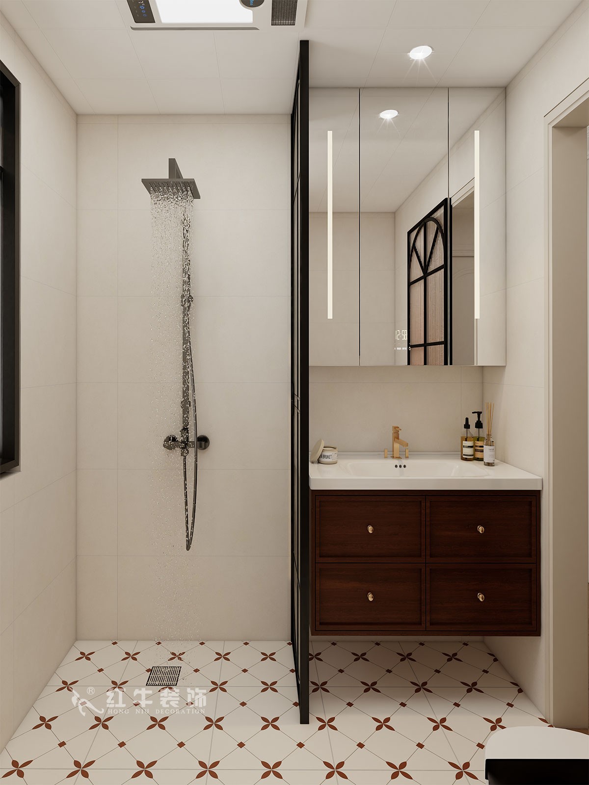 材質運用:全屋通鋪木紋磚,保留自然質感的同時提升耐用性;衛生間采用彩色花磚與幾何腰線組合,局部點綴黑色五金,凸顯復古趣味。