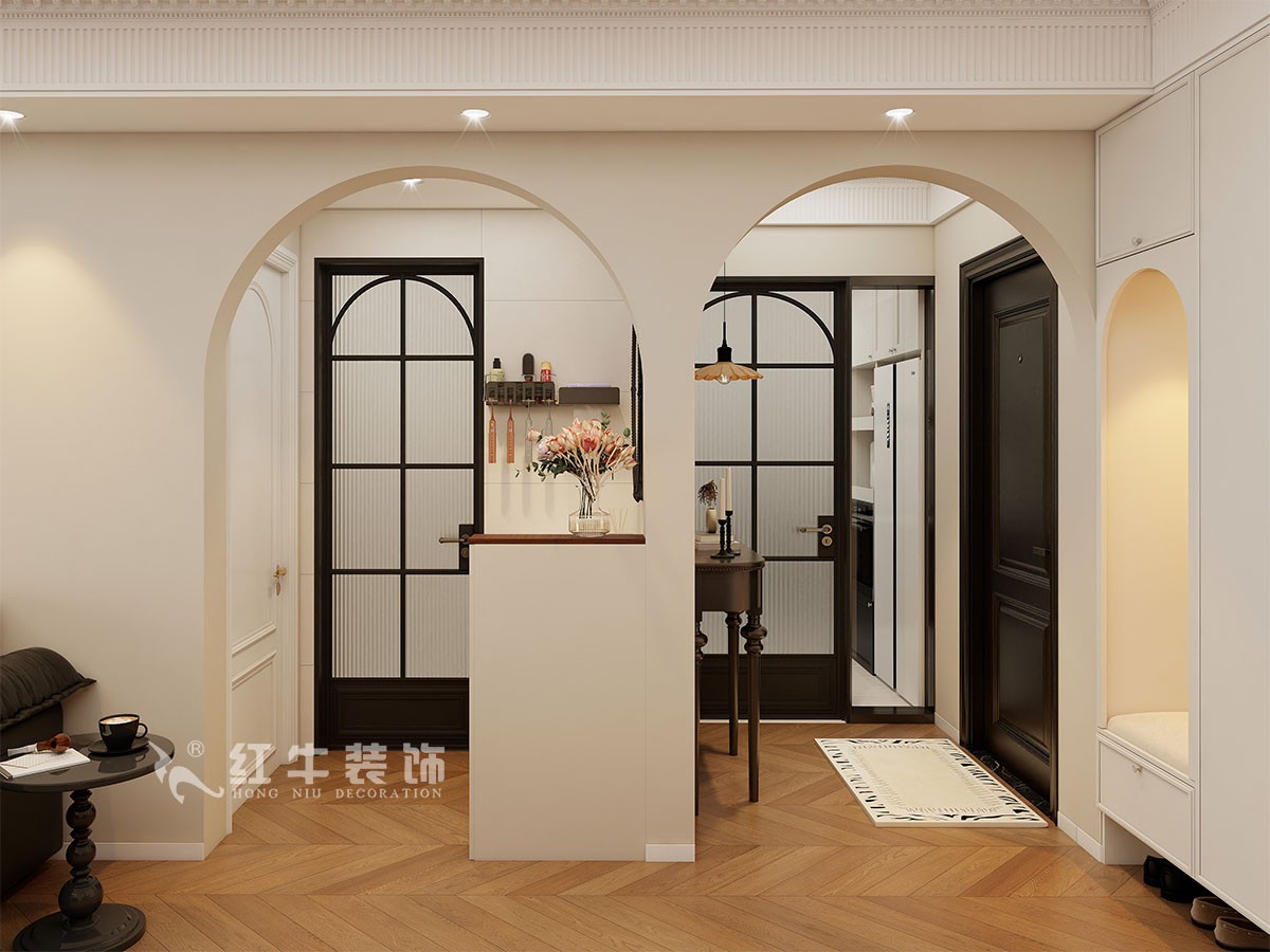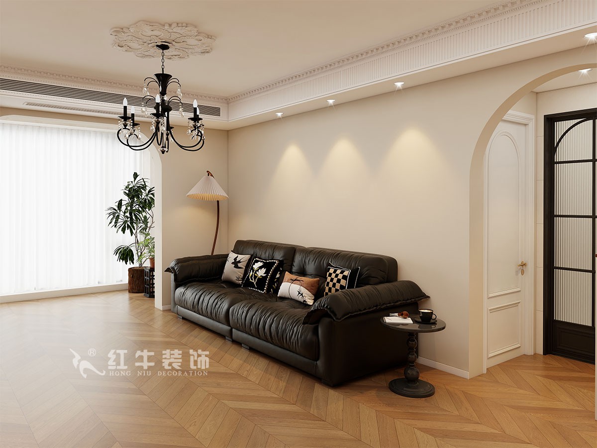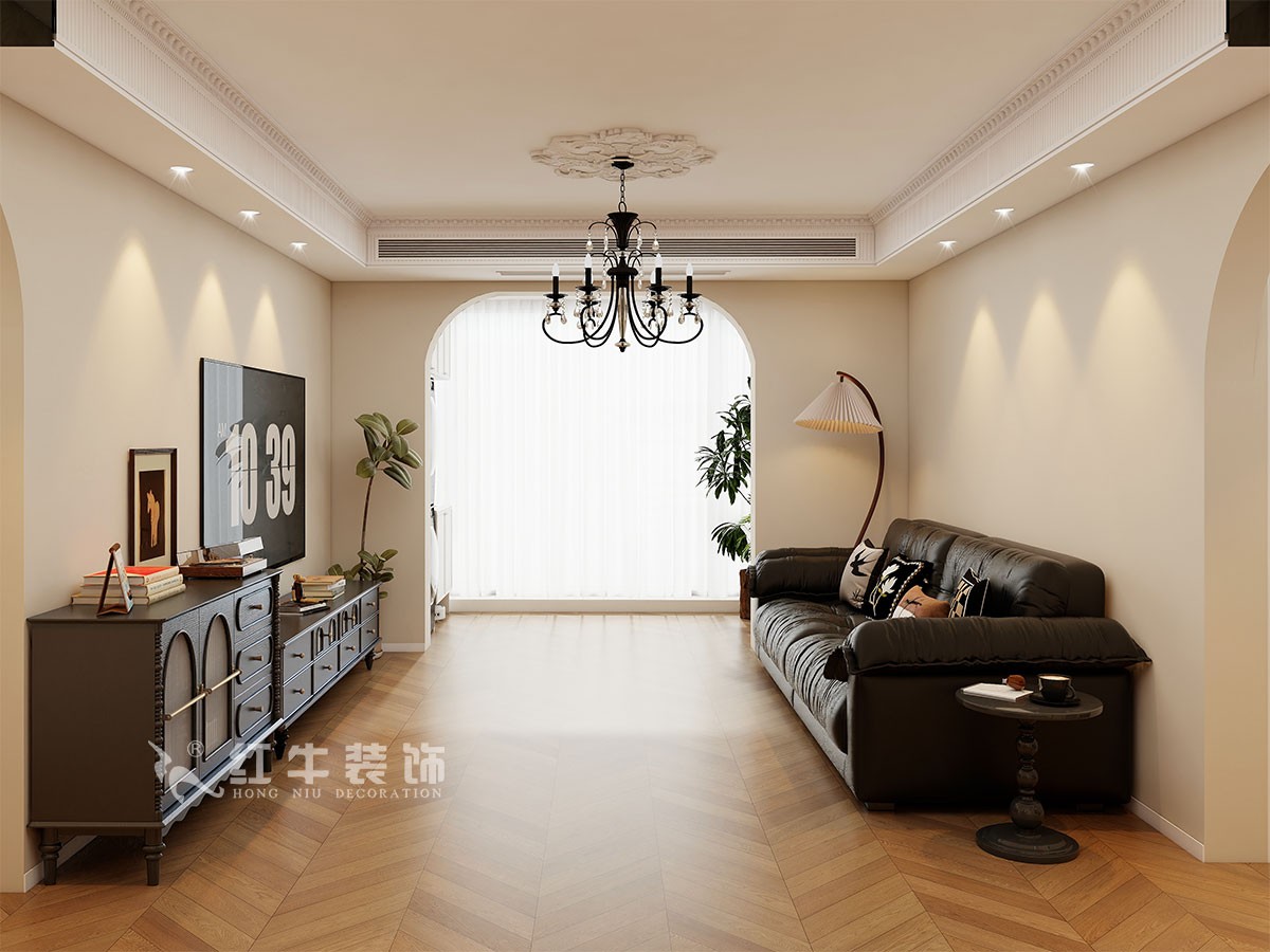 小兩口居住,女業(yè)主對(duì)裝修希望比較時(shí)尚大氣,希望未來(lái)的房子實(shí)用、大氣,最終確定了法式復(fù)古風(fēng),而本案在設(shè)計(jì)時(shí)其特色是將設(shè)計(jì)的元素、色彩、照明、原材料簡(jiǎn)化到最少程度。但是對(duì)材料的舒適度要求很高。因此,考慮全屋通鋪木紋地板磚,配合拱形門,以極少的元素去表達(dá)空間的氛圍感。