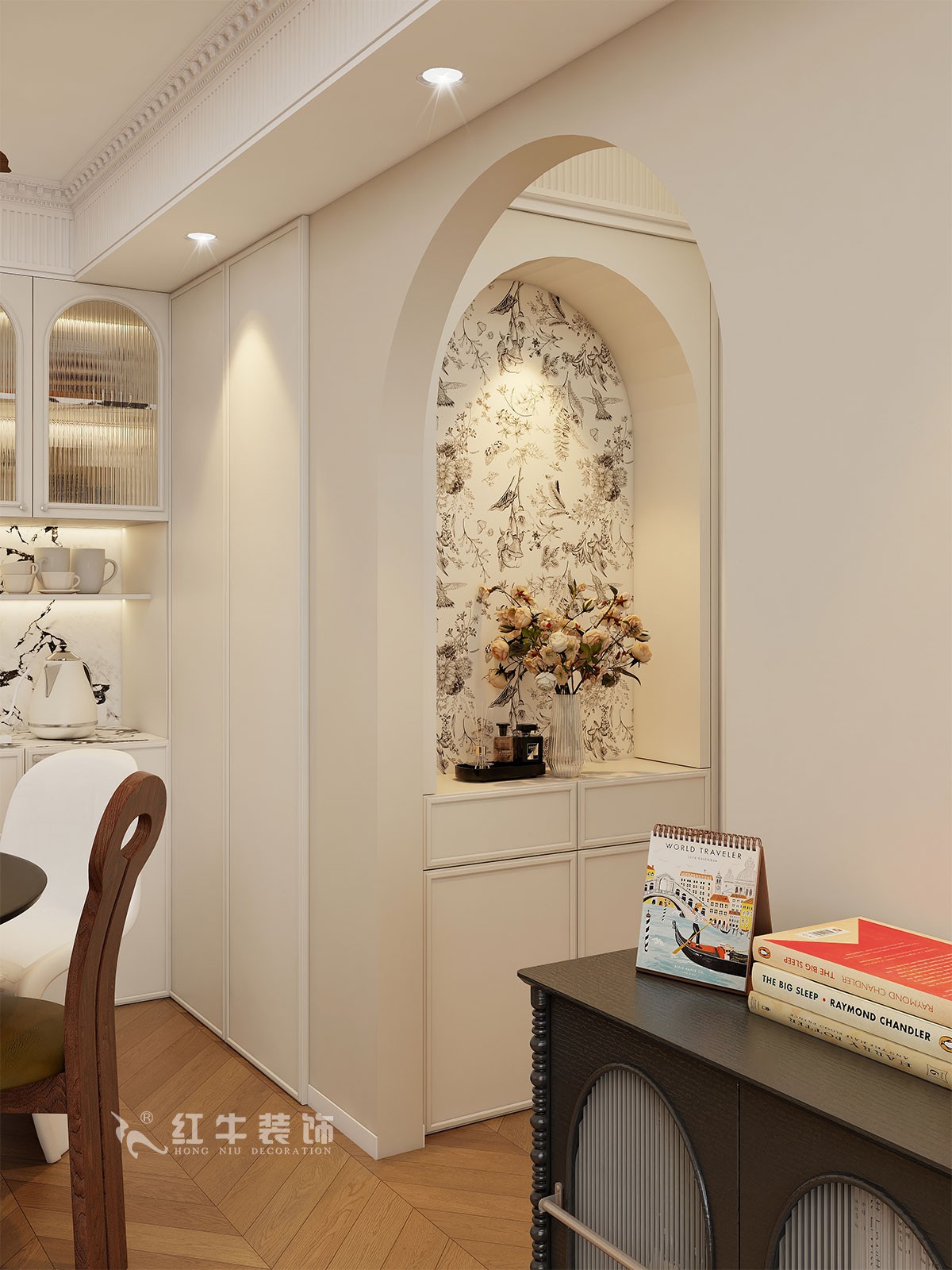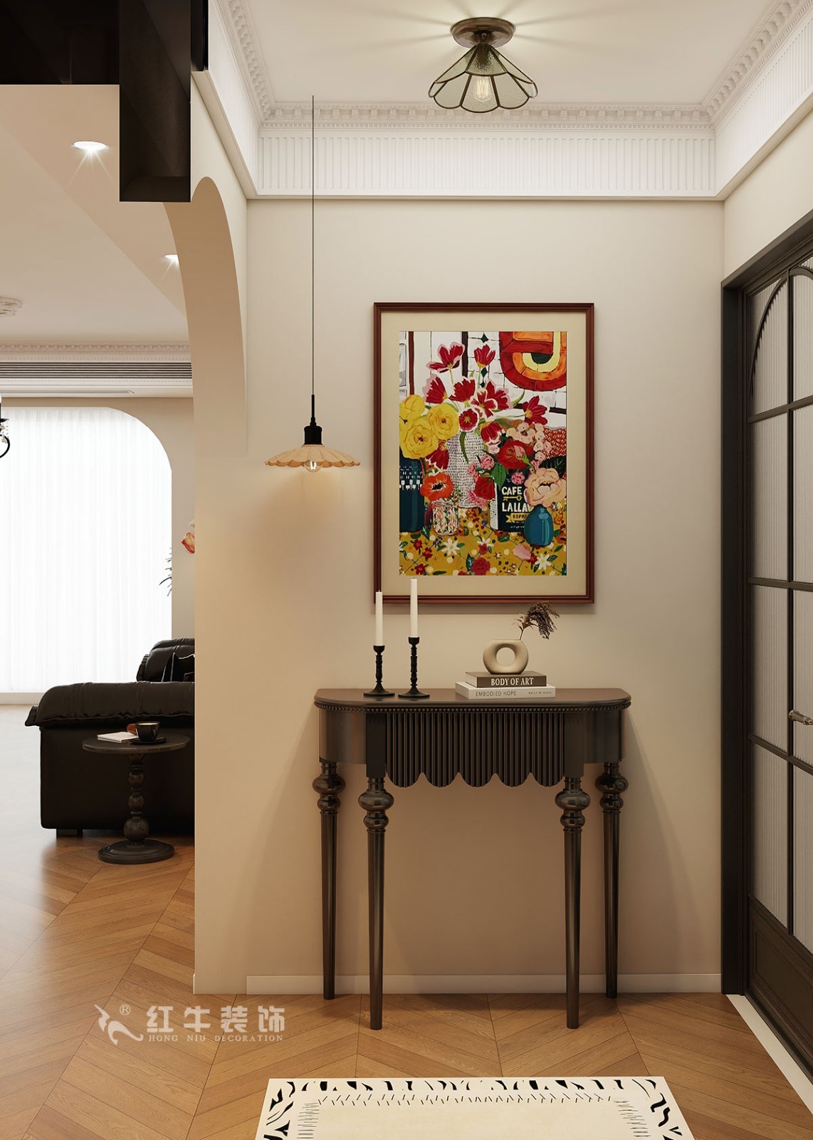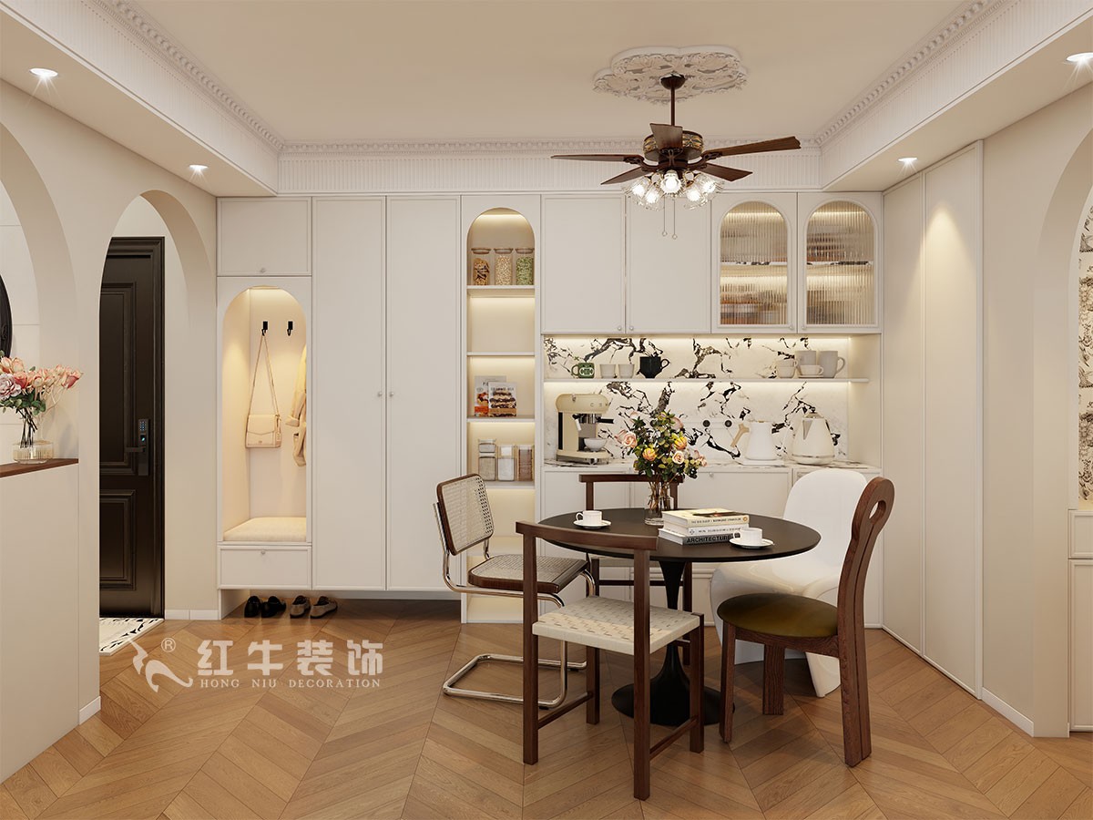 小兩口居住,女業(yè)主對(duì)裝修希望比較時(shí)尚大氣,希望未來(lái)的房子實(shí)用、大氣,最終確定了法式復(fù)古風(fēng),而本案在設(shè)計(jì)時(shí)其特色是將設(shè)計(jì)的元素、色彩、照明、原材料簡(jiǎn)化到最少程度。但是對(duì)材料的舒適度要求很高。因此,考慮全屋通鋪木紋地板磚,配合拱形門,以極少的元素去表達(dá)空間的氛圍感。