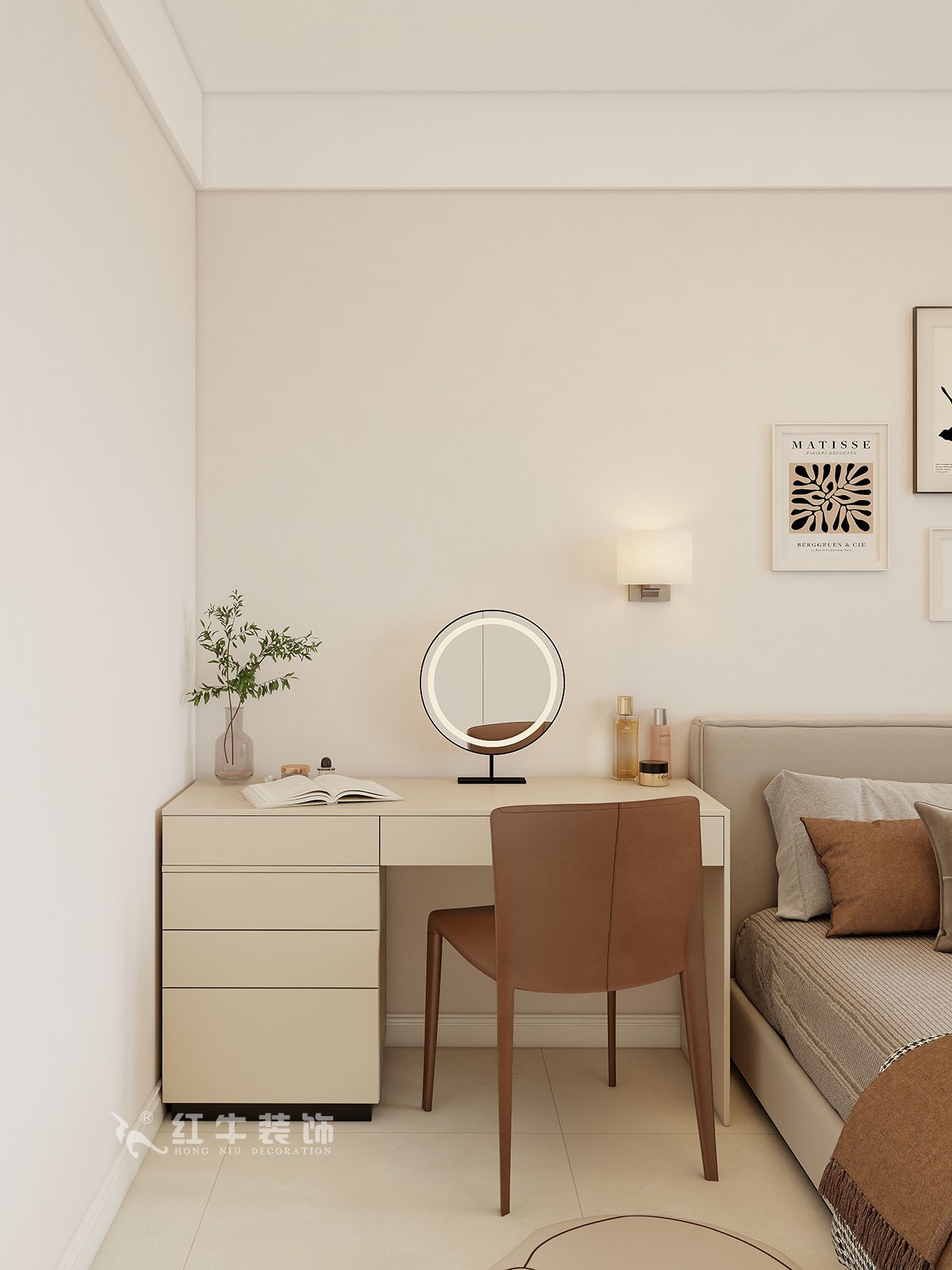色彩搭配:以暖色調為主,墻面采用米色、淺咖等柔和色彩,搭配深木色家具,營造氛圍。