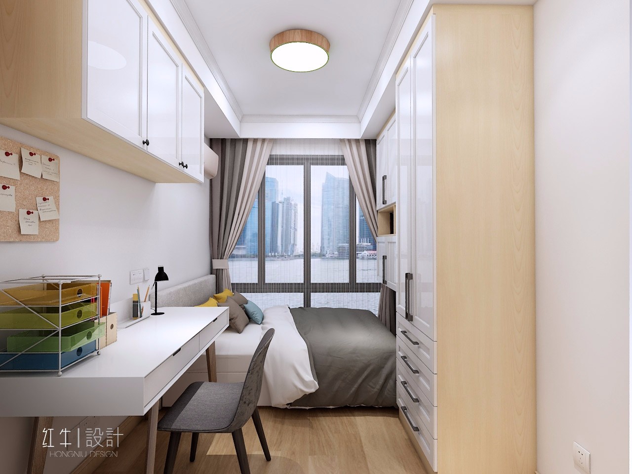 次臥,雖然面積不大,利用率卻不小,到處是柜子。到頂衣柜下面有四個抽屜,是存放各種小物件的最佳場所。桌上、床前都是吊柜,中空部分可以放裝飾品。