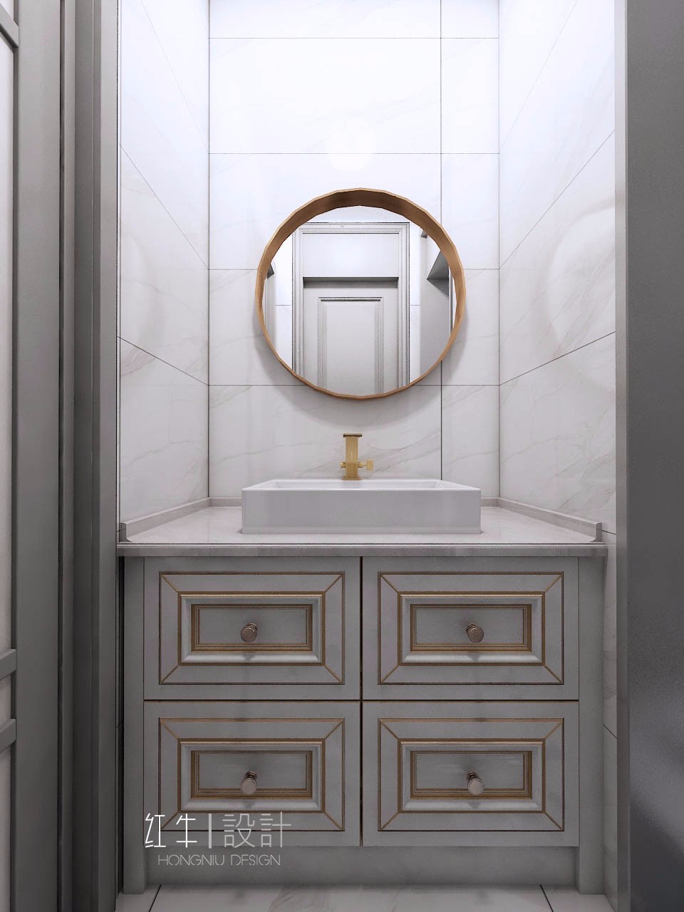 洗手臺被安在衛(wèi)生間外面,整體看起來大方簡約,亦考慮到實用功能,簡潔、利落的圓形鏡,為其添加了一點個性與特色。