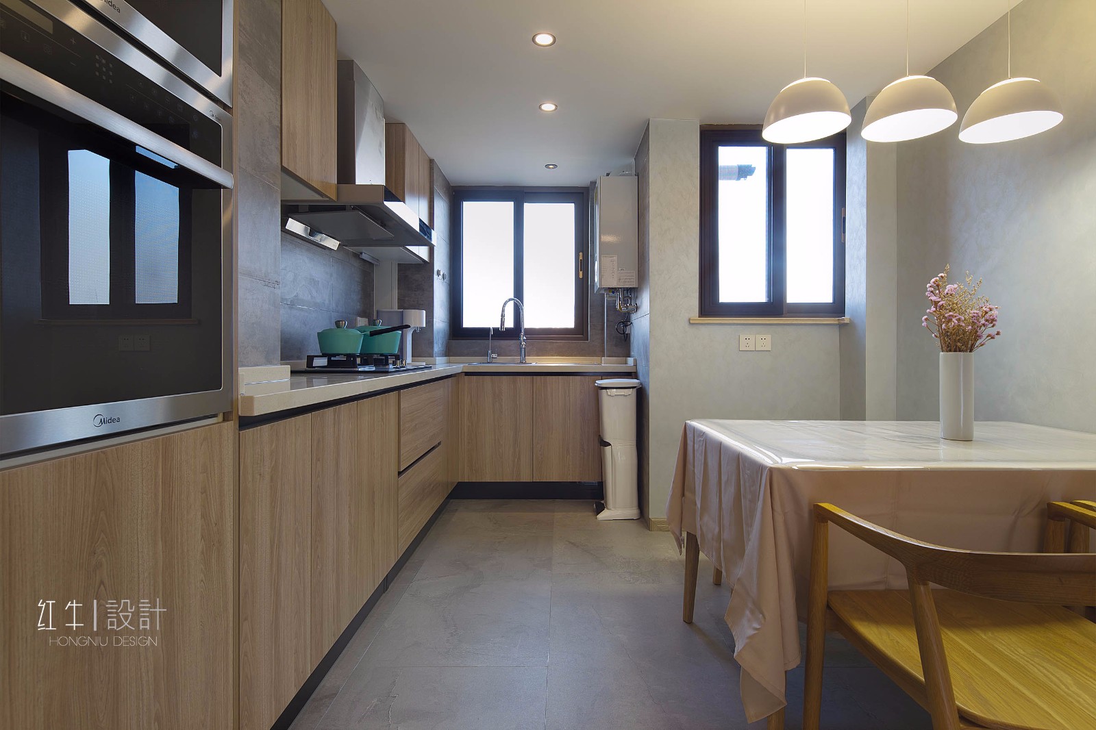 三盞吊燈搭配簡(jiǎn)單的桌椅,就是一個(gè)簡(jiǎn)約又舒適的餐廳區(qū)。