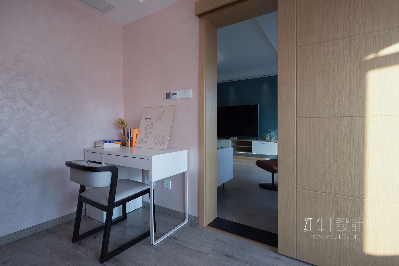 客廳的后方,就是一個(gè)書(shū)房,低飽和度的粉色墻壁,顯得非常柔美。