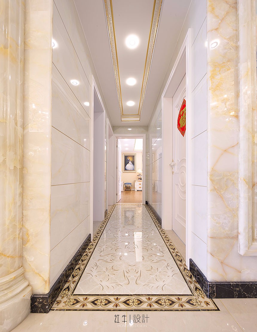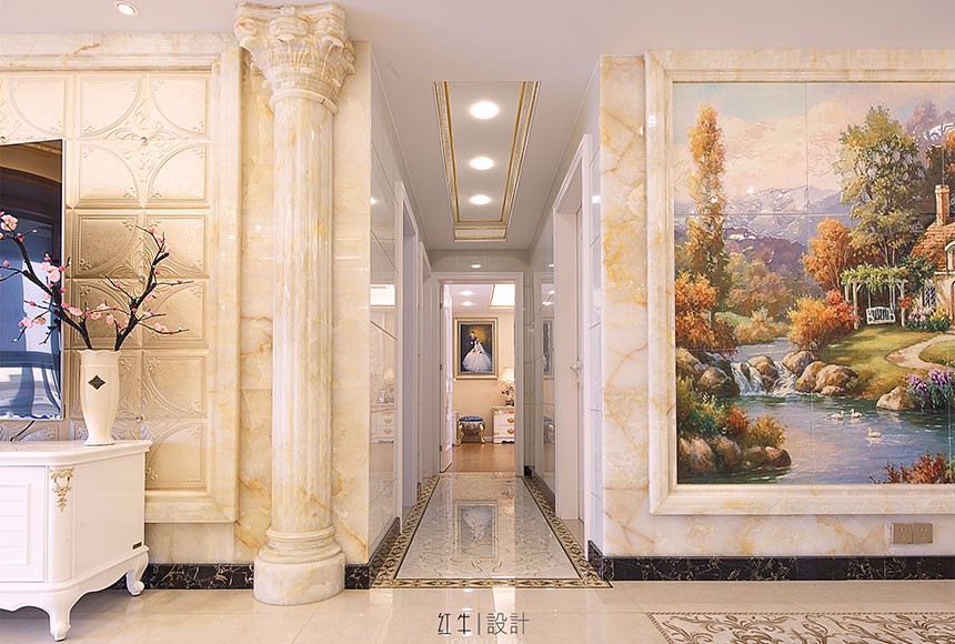 從全面考慮,在總體布局上方面盡量滿足業主生活的需求,主要裝修以基礎的材料為主,配合簡潔墻面,使空間感更加豐富。創造出了一個溫馨,健康的又不失個性的家庭環境。過道石柱原型是古希臘帕特農神廟的石柱,玄關以石柱和簡潔的線條打造出神圣的空間。玄關盡頭是業主的結婚照,如此一來顯出兩人的愛情的神圣和忠貞。