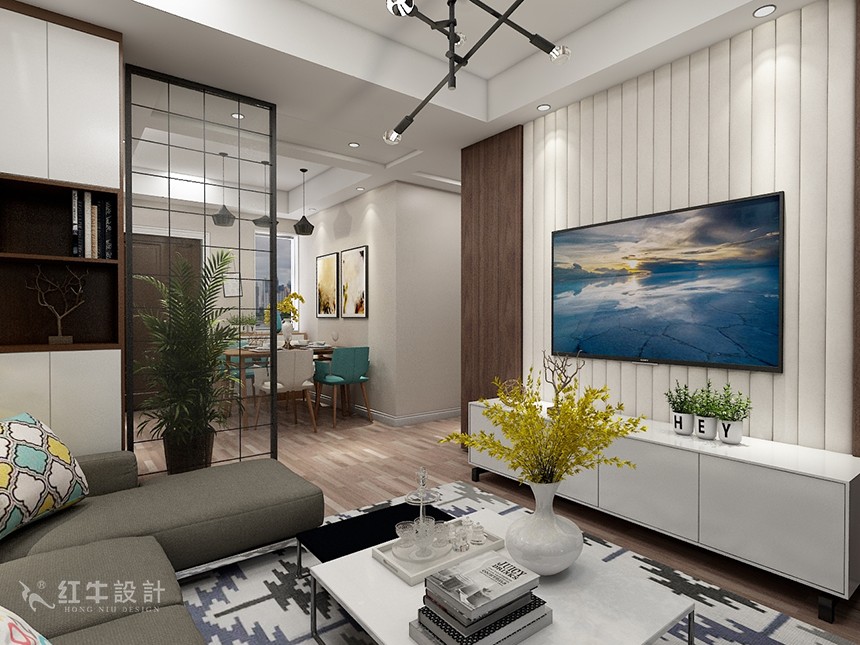 餐廳與客廳之間有一道玻璃隔斷,區域之間有了劃分,同時又能透光。白色豎條紋造型的電視背景墻與整體風格和諧統一,又有著自己獨特的小別致。