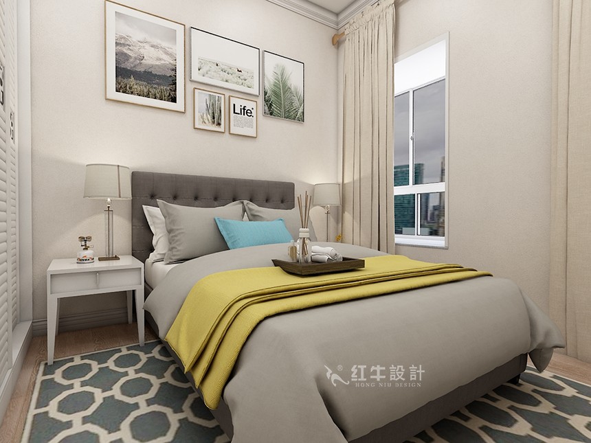 淺色的墻壁背景下,深灰色的大床加上淺灰色的床品,再搭配上地毯,整體感覺簡潔優雅,黃色的加入提亮了空間,給人恰到好處的溫暖。