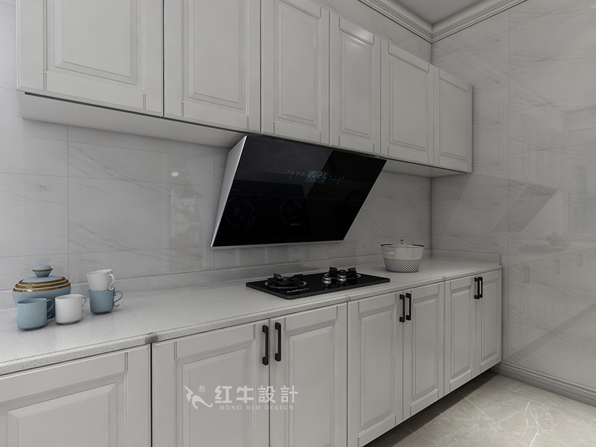 L形操作臺(tái)設(shè)計(jì),最大化的釋放了廚房的操作空間,白色櫥柜顯得干凈清爽,在兼具家居空間美感之余,又完美地收納了各類廚房物品。