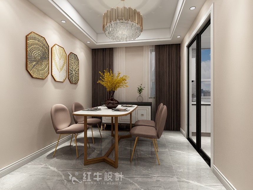 餐廳延續(xù)了客廳的設計風格,玲瓏質感的吊燈散發(fā)出柔和的光芒,配合墻面的藝術掛畫,提高了用餐區(qū)的格調。