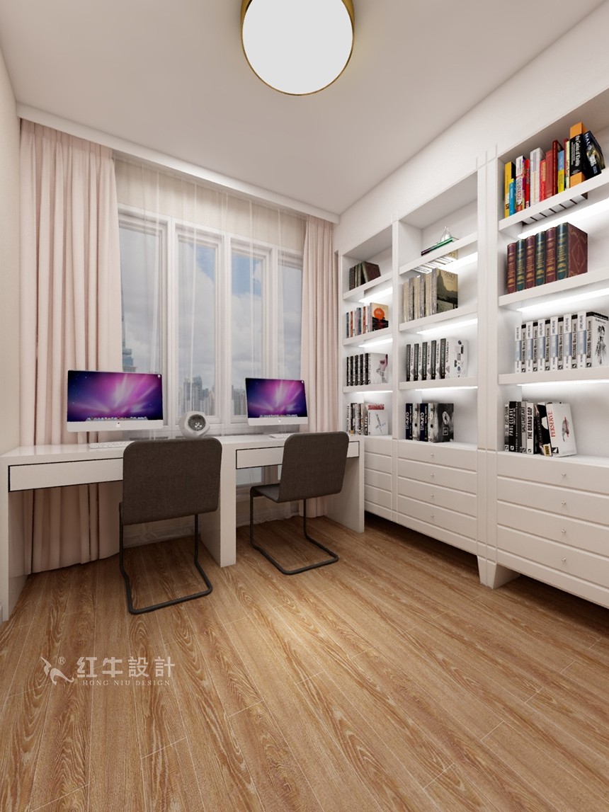 簡潔清爽的白色書柜搭配淺色木地板,營造出良好的學習氛圍,這里可以容納兩個人同時學習工作。