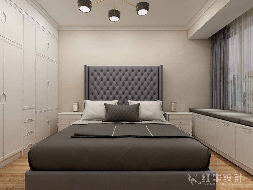 簡潔溫馨的臥室正中放上一張深色大床,非常符合主臥沉穩(wěn)大方的氣質,為空間注入一抹優(yōu)雅。