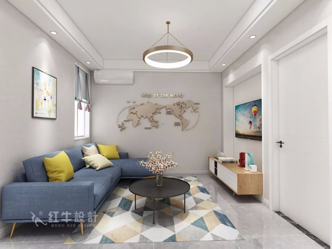 客餐廳連為一體的設計讓空間寬闊舒服。藍色布藝沙發與幾何圖案地毯都是典型的北歐風格,與穩重的灰色墻面形成互補感。