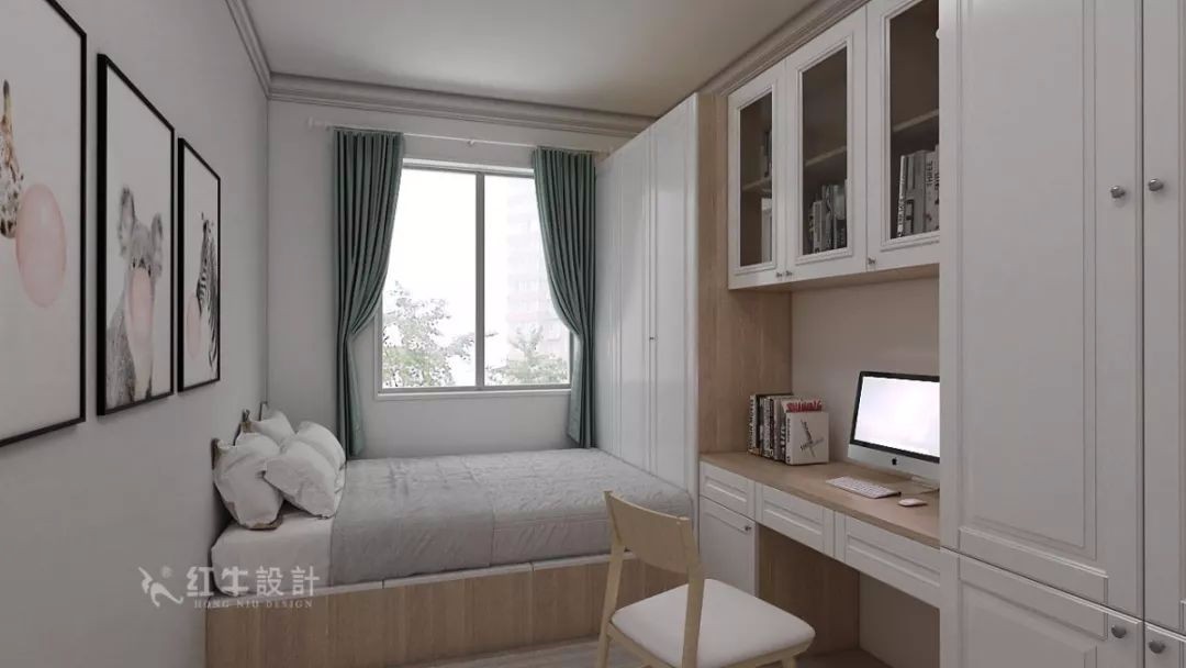 次臥設計成榻榻米房,將睡眠空間、閱讀空間和收納空間結合起來,木色的整體柜體搭配白色的歐式面板讓空間顯得簡潔舒適。