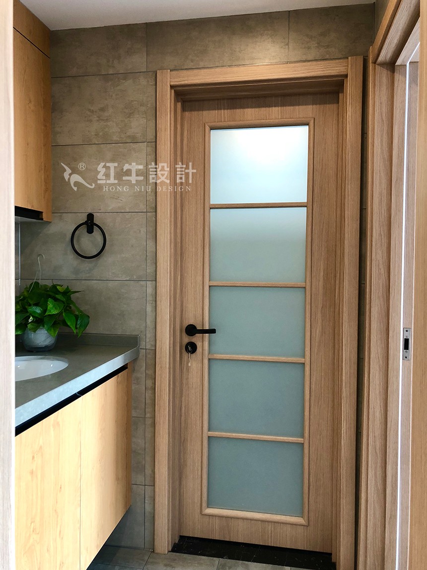 陽(yáng)臺(tái)與客廳之間采用玻璃推拉門(mén)隔開(kāi)。陽(yáng)臺(tái)設(shè)計(jì)了洗衣臺(tái),美觀又實(shí)用,柜面的水泥灰具有天然感和穩(wěn)定的魅力,帶來(lái)一種自然質(zhì)樸的空間感受。