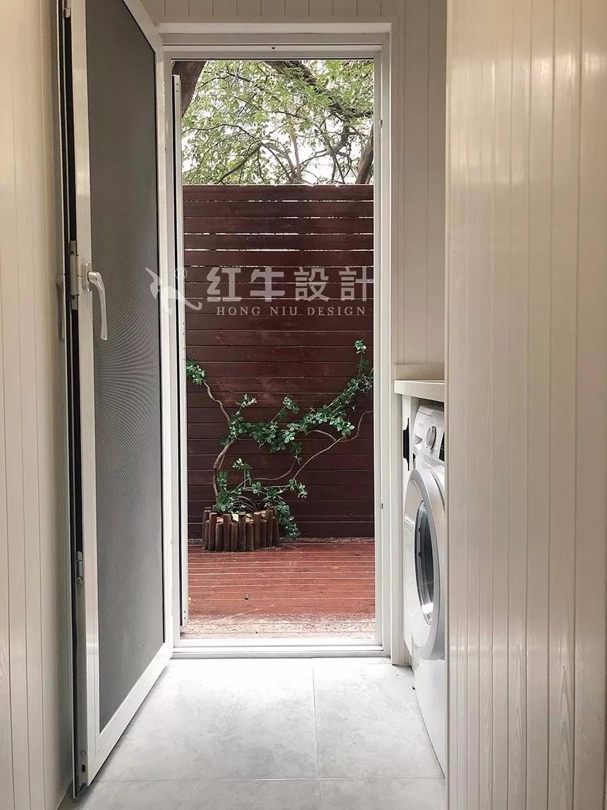 過道通向外面的小院,這邊放置了洗衣機,相鄰處背面是廚房放置冰箱的位置,空間得到了很好的利用。