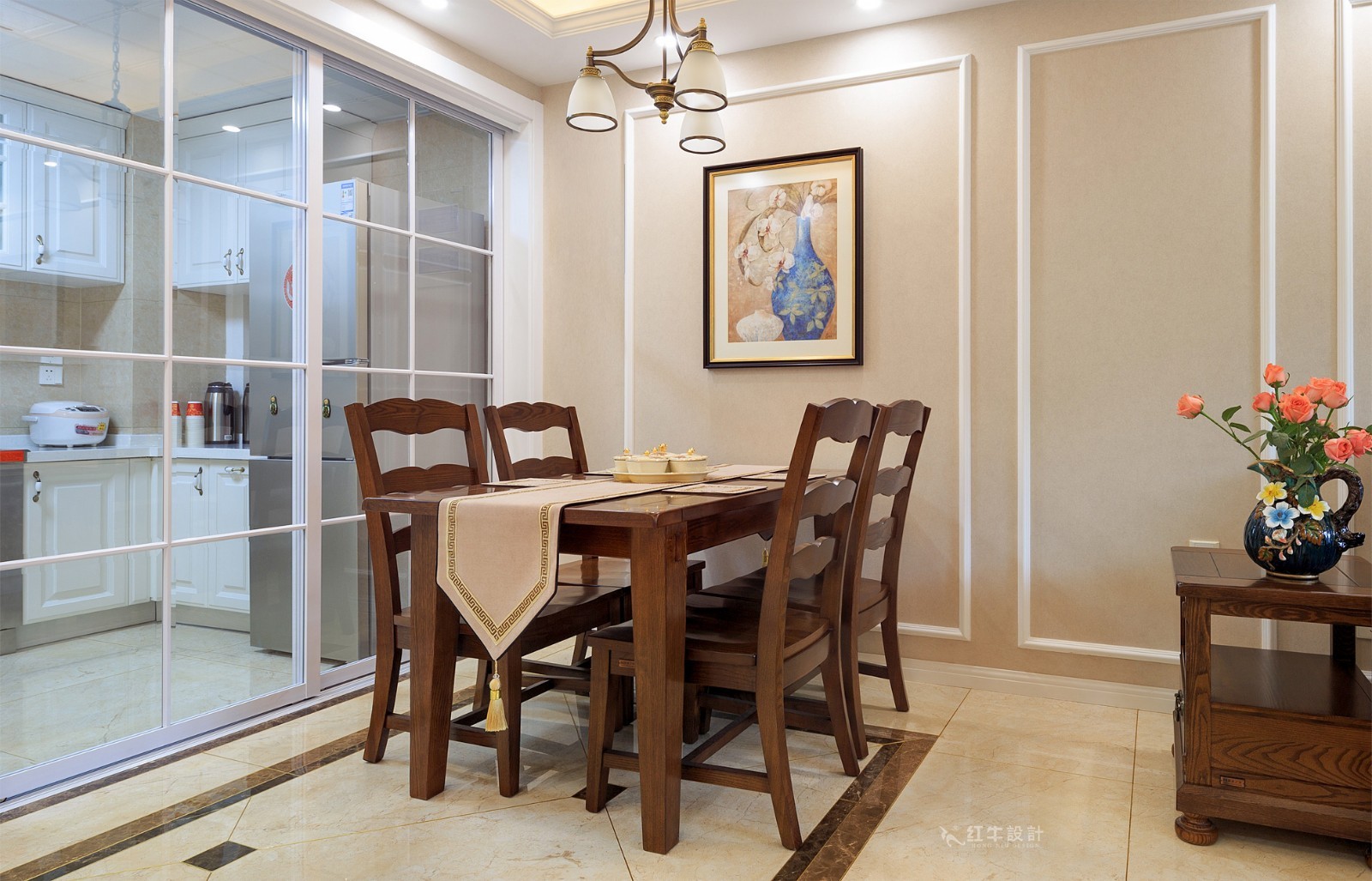 簡(jiǎn)潔大方的餐廳,桌上鋪著色彩協(xié)調(diào)的桌旗,墻上掛著古典氣質(zhì)的裝飾畫(huà),起到了提升格調(diào)的作用。