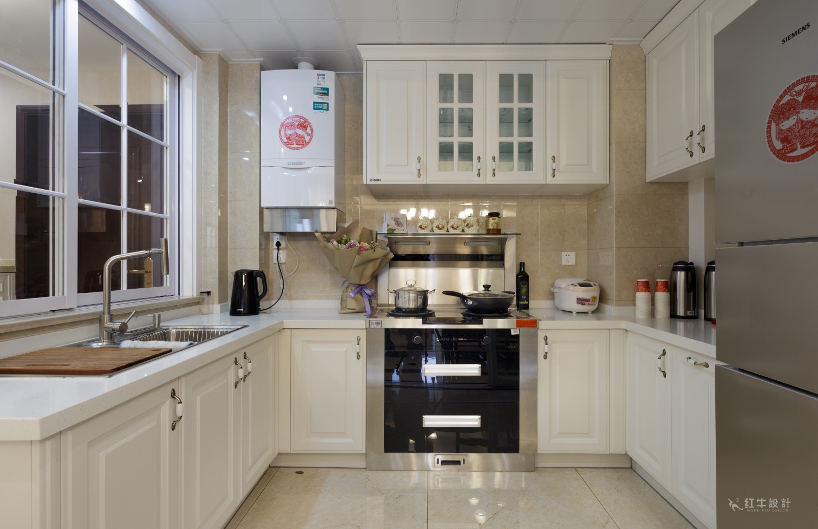 廚房和餐廳之間隔了一道推拉門(mén),避免油煙外泄。純白的廚房空間看起來(lái)清爽整潔,U型設(shè)計(jì)非常實(shí)用。