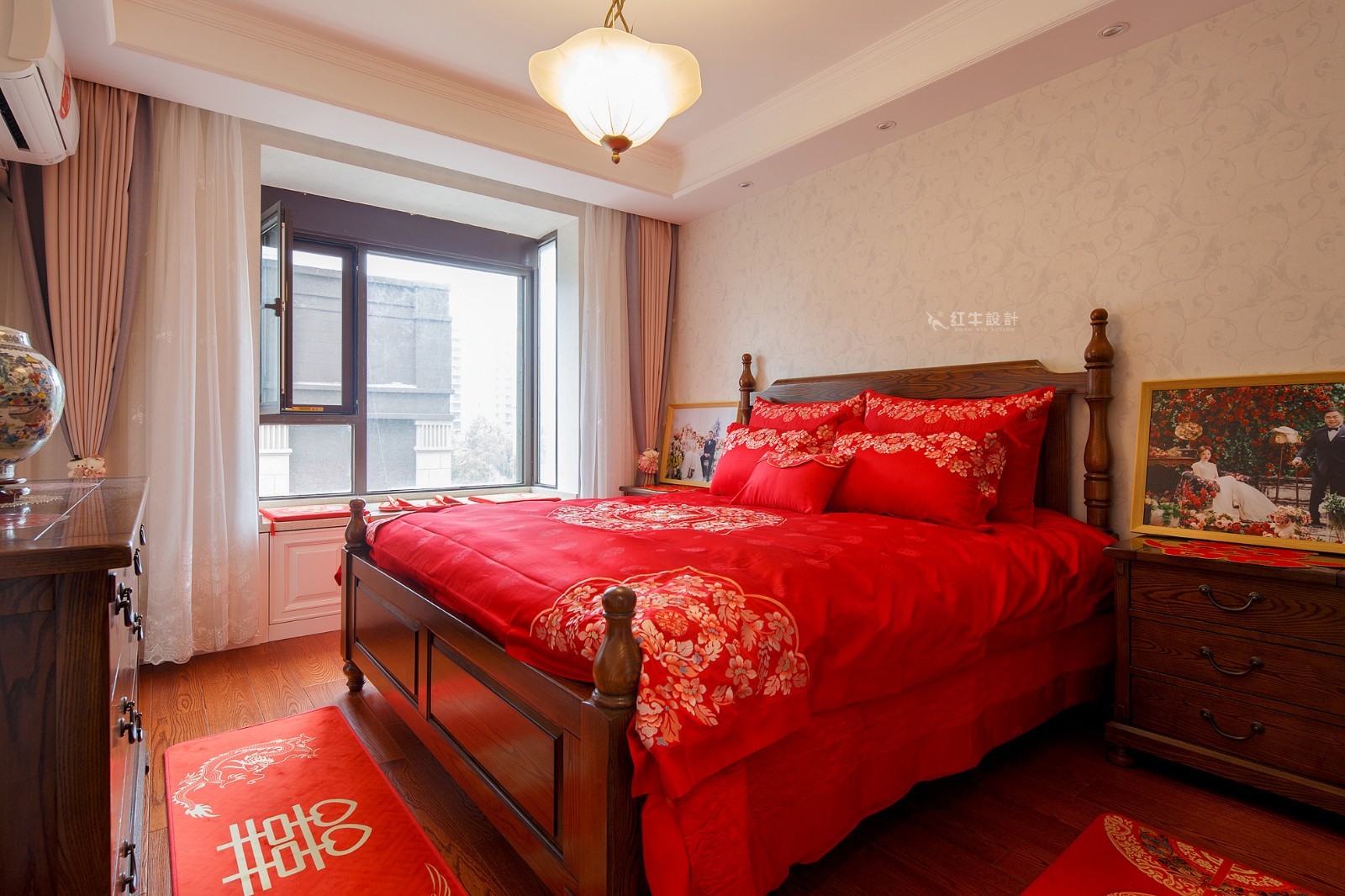 主臥暖暖色調(diào)的背景墻,加上喜慶的床品鋪設(shè),在燈光的照射下,顯得格外溫馨。
