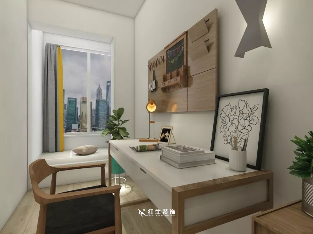 墻角的位置放置了書桌,設計了壁掛燈,不占空間,而且美觀實用。