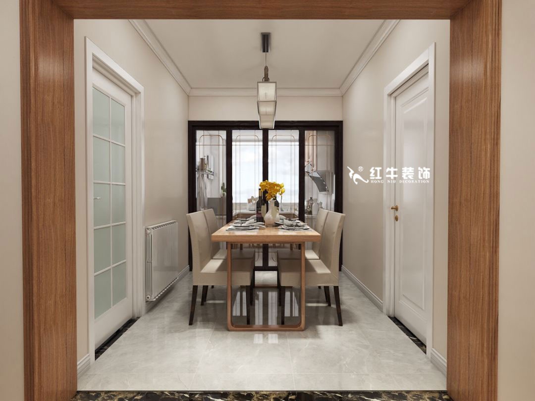 廚房與餐廳之間采用透明推拉門,能夠讓陽光能夠更好地穿透到室內,餐廳選擇了地磚,也能讓餐廳更顯通透明亮。