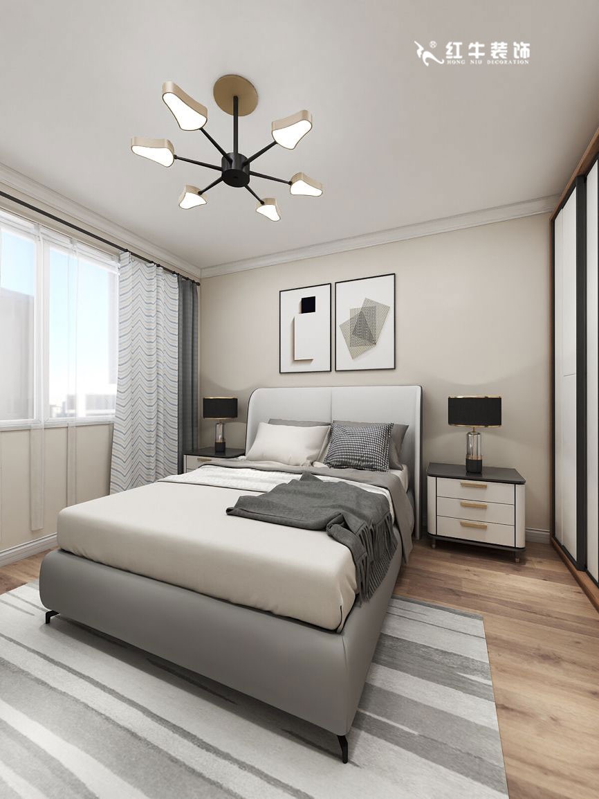 次臥主要由黑、白、灰構成,硬朗的黑色讓空間更加立體,地毯與床品相呼應,營造出一種和諧之美。