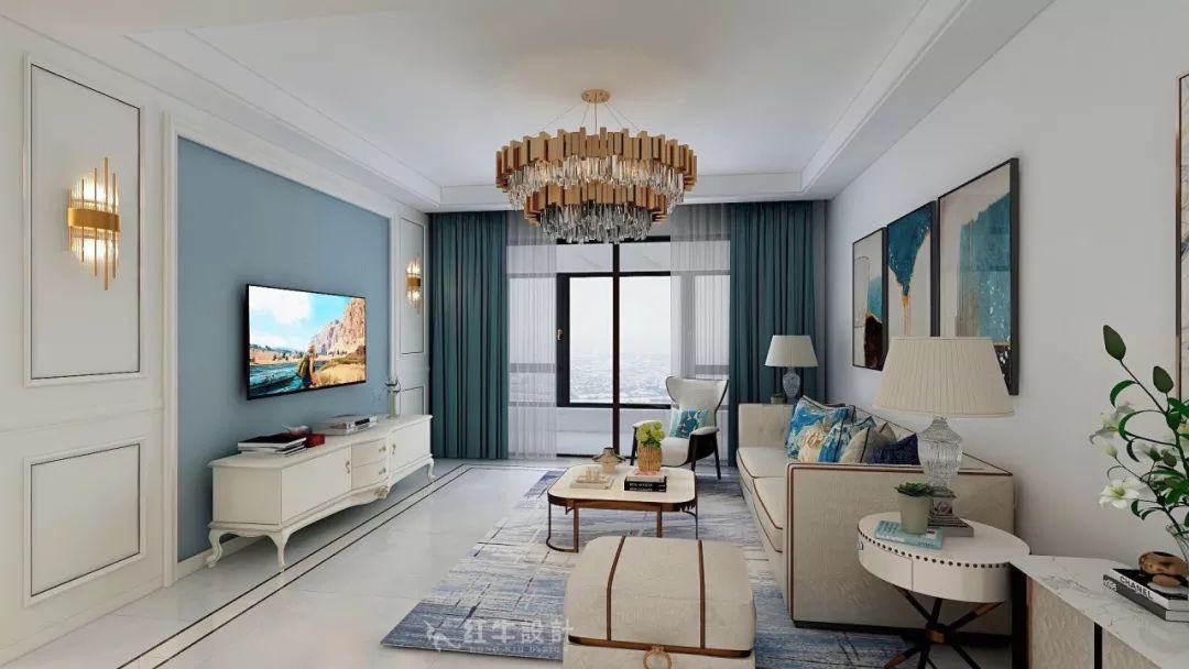 客廳以白色與藍色為基礎色調,整體風格干凈明快。