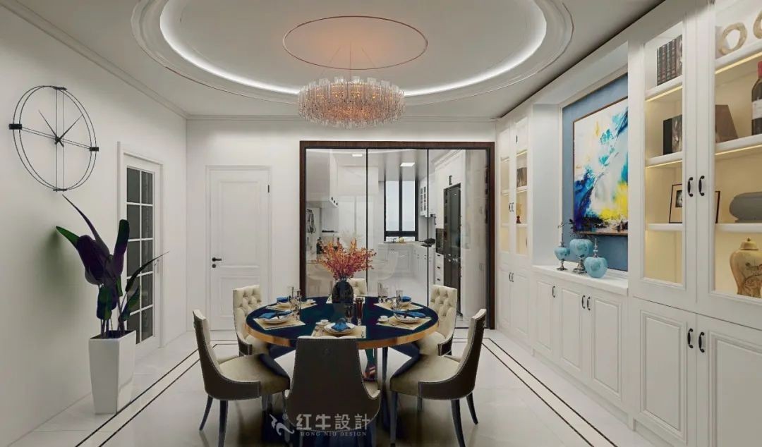 在吊頂和餐桌的選擇上,都使用了圓形,顯得空間飽滿豐富。