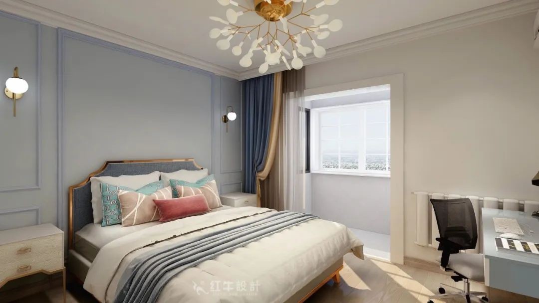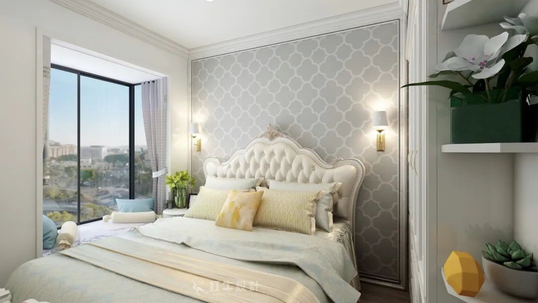 主臥考慮到是給長輩居住,在色調跟款式上略顯穩重,灰色格紋的墻紙跟歐式的床形成鮮明的對比。