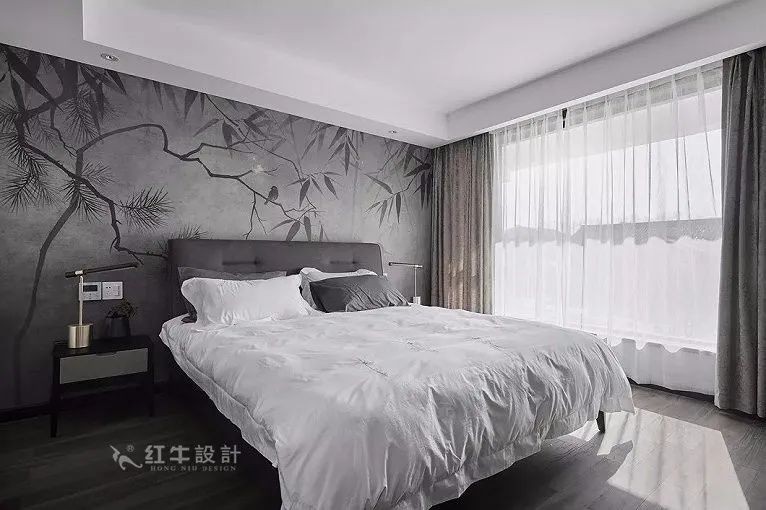 家具造型以簡潔的線條為主,背景墻是極具東方韻味的竹葉墻布,嚴(yán)整的格局和平和的調(diào)性渾然一體,契合中國傳統(tǒng)文藝崇尚的中和雅正之美。