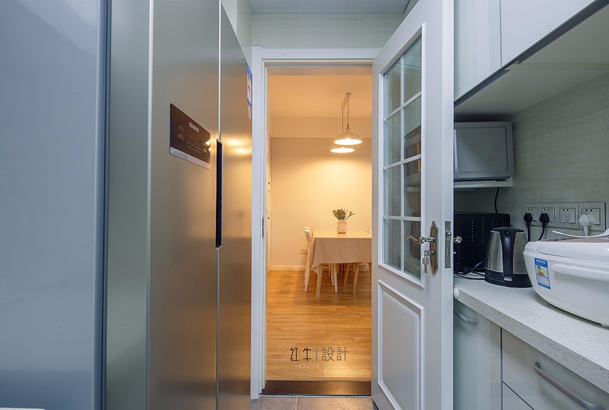 2.由于廚房的開(kāi)間比較小,只夠做一個(gè)L型的柜子,再加上要放雙門冰箱,廚柜操作臺(tái)面特別小,所以把衛(wèi)生間和廚房的中間墻體拆掉,縮小的衛(wèi)生間的開(kāi)間,擴(kuò)大了廚房的空間,增出了很多臺(tái)面。