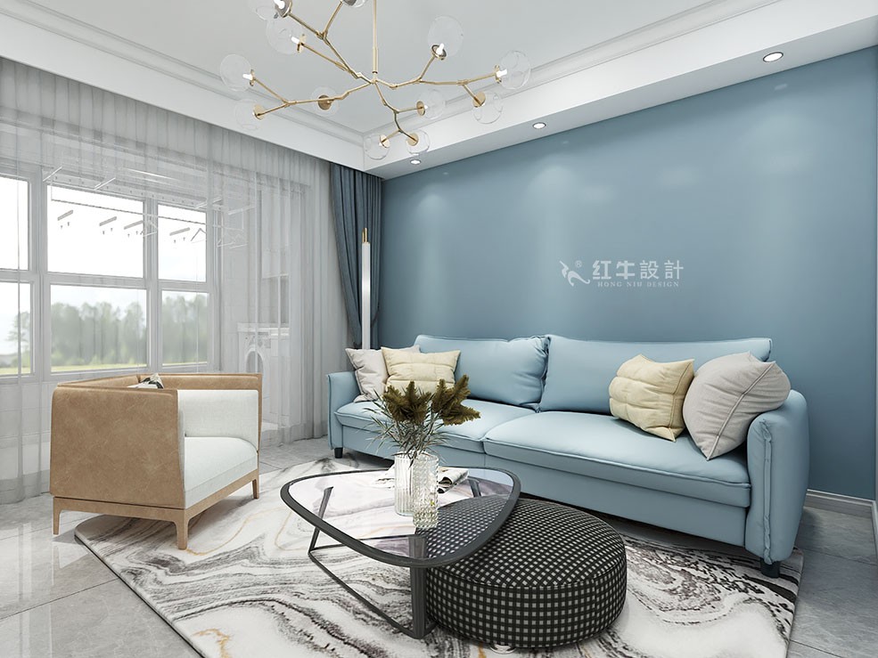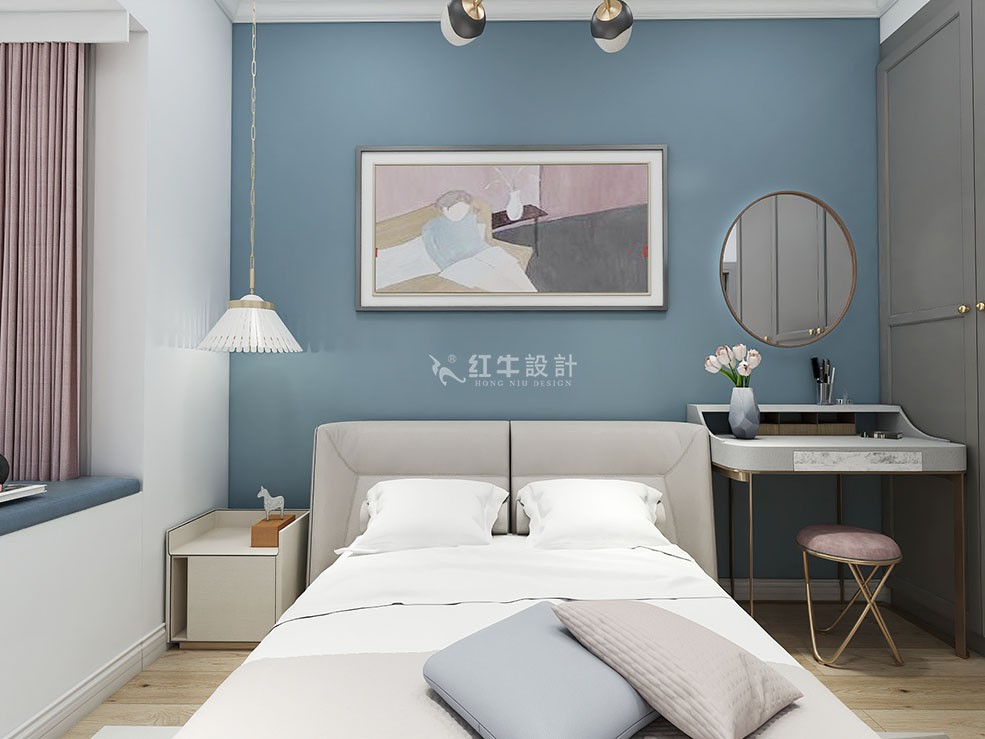 本案以輕松愉悅的北歐風設計感與溫馨家的氛圍為出發點,公共區域客廳用霧霾藍背景墻,與其他區域形成鮮明對比,著重空間視覺重點。私密區域,次臥增加梳妝臺,床頭一側的小吊燈,不對稱的設計,不拘一格。兒童房榻榻米,與淡黃色的乳膠漆,顯得空間童趣又具有足夠的儲藏空間。整體營造北歐風與溫馨家的氛圍。
