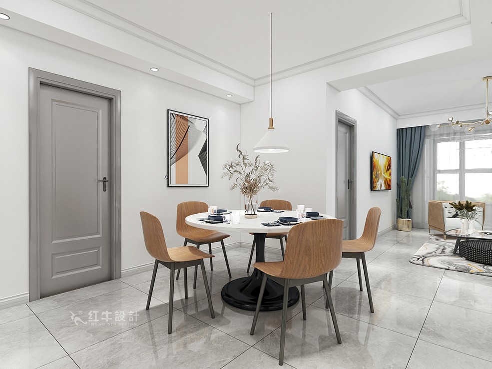 圓形餐桌互動性很強,家人圍桌而坐,顯得更加親密。客餐廳選擇的灰色瓷磚,無論是耐磨還是易清潔方面,都符合大多數業主的追求。