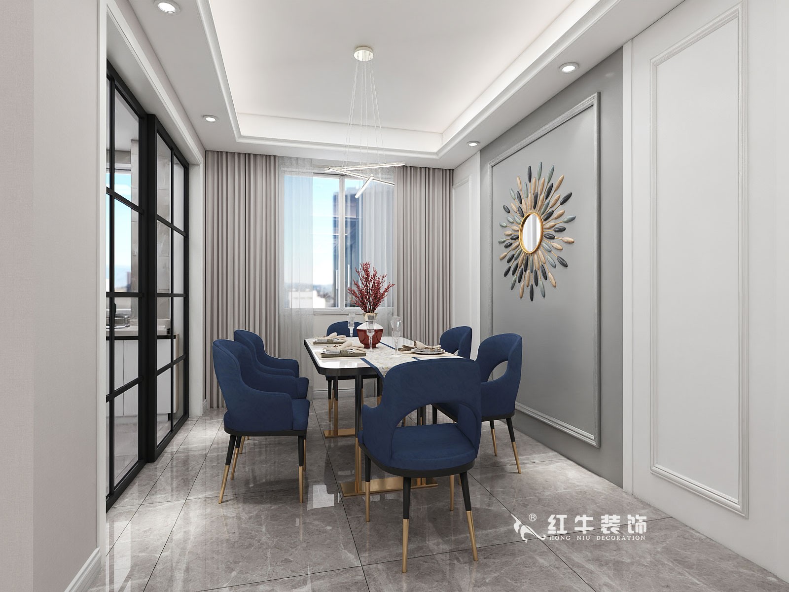 深藍色的餐椅特別吸晴,與大理石餐桌相結合,給人一種優雅輕奢的感覺。墻上包含鏡子的裝飾很有特色,還能增加空間層次感。