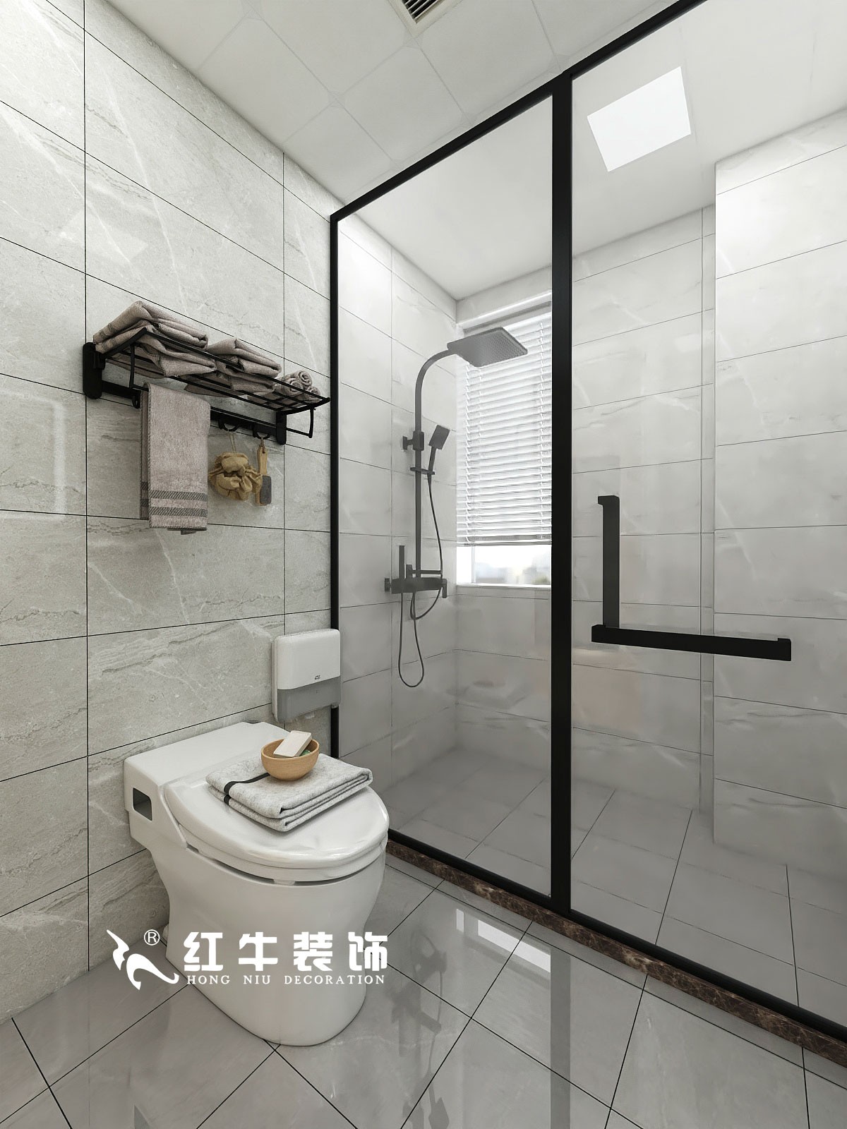 黑色邊框淋浴房加黑色的五金件,與墻地面形成對比,整體比較耐看。同樣材質的置物架很好地利用了馬桶上方的位置,平時可以用來放置浴巾、懸掛毛巾。